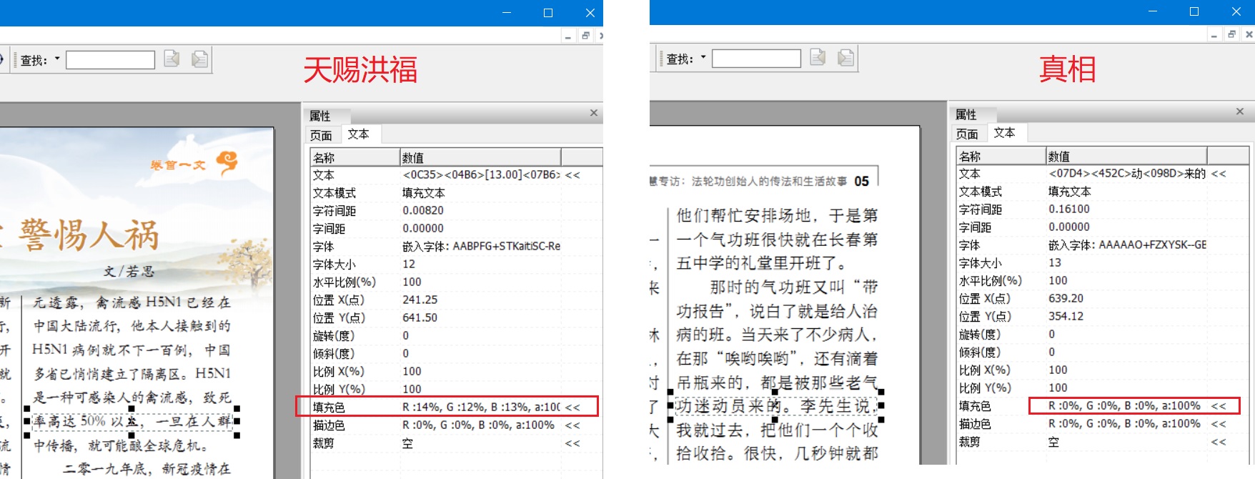 打印小册子《真相》146期的效果还是挺好的,但是打印其他册子或传单效果就不好,主要是文字的颜色偏浅,且文字发虚。用福昕PDF对比《真相》与其他册子的文字字体,发现《真相》的字体颜色是纯黑色,但是其他册子的字体颜色并不是纯黑,而是深灰(参看附件图片)。