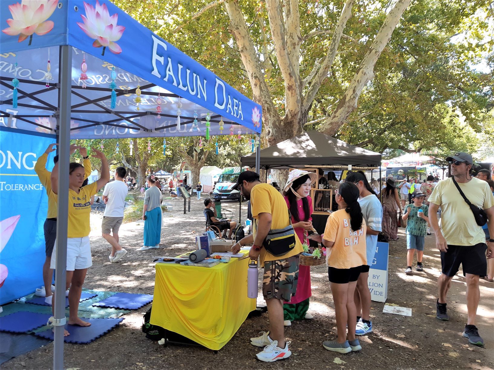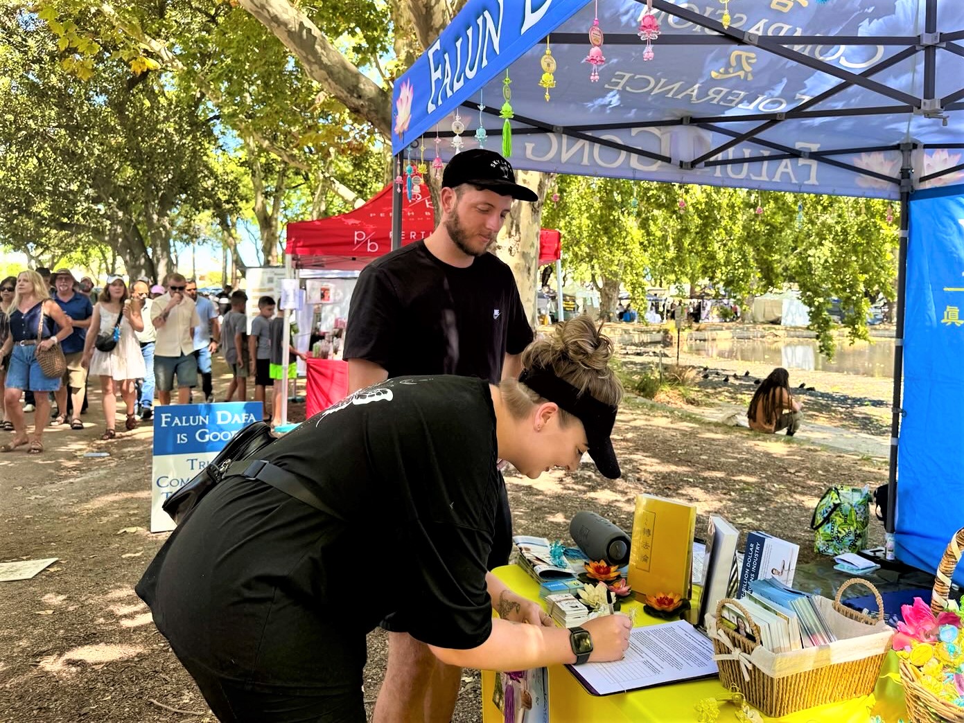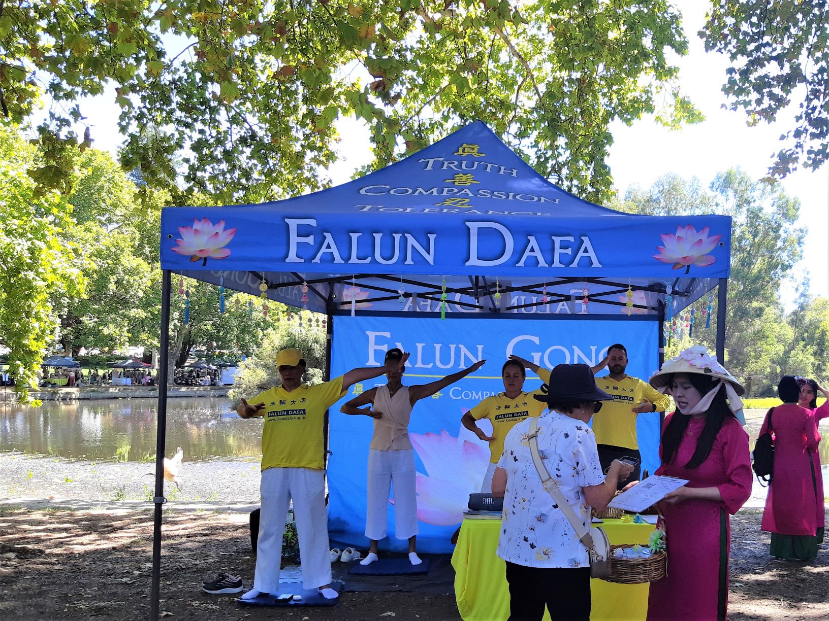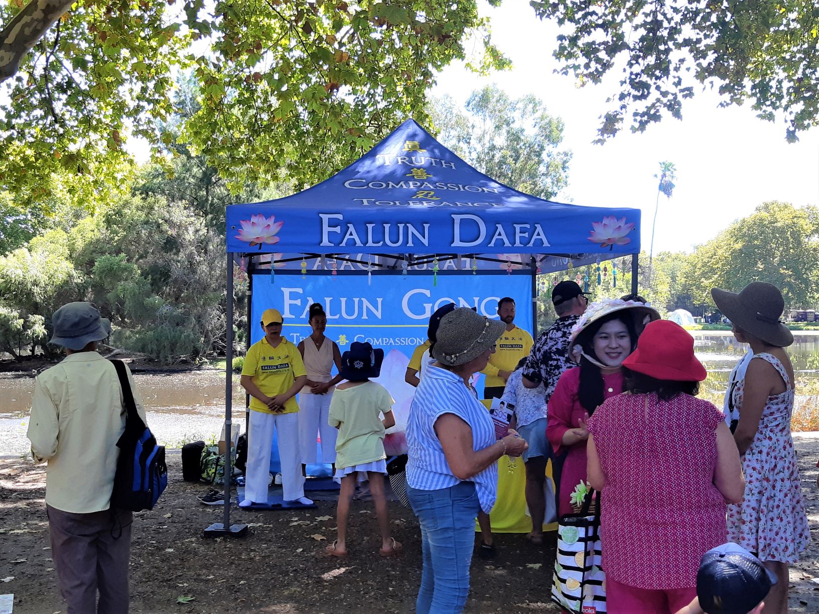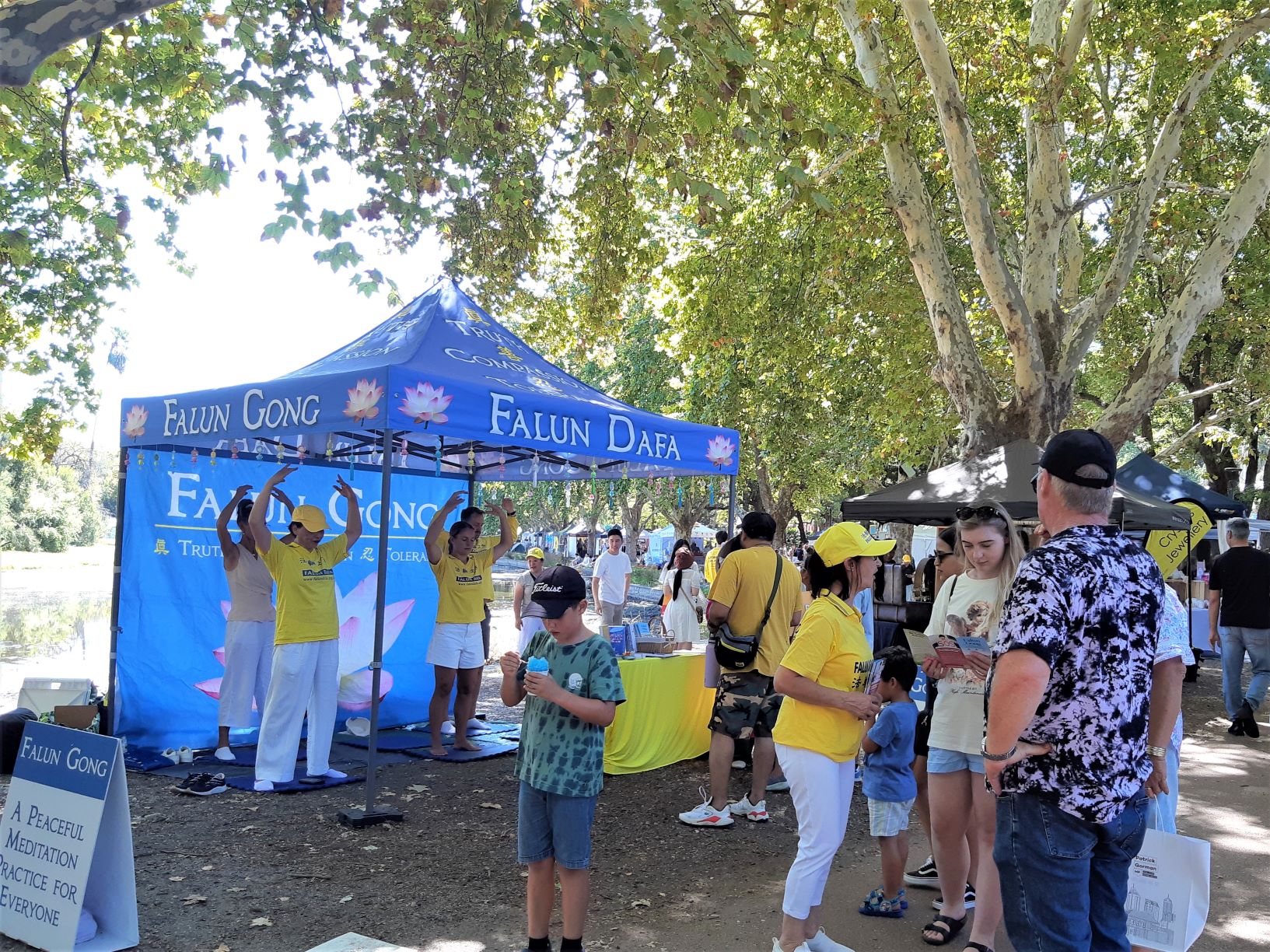 法轮功学员在展位上介绍法轮功,演示五套功法,也向民众讲述法轮功被中共迫害的真相。人们接过真相资料,表示会了解更多,有的在反迫害征签表上签名支持法轮功。很多人表示对法轮功感兴趣,想要学炼,并询问炼功地点。