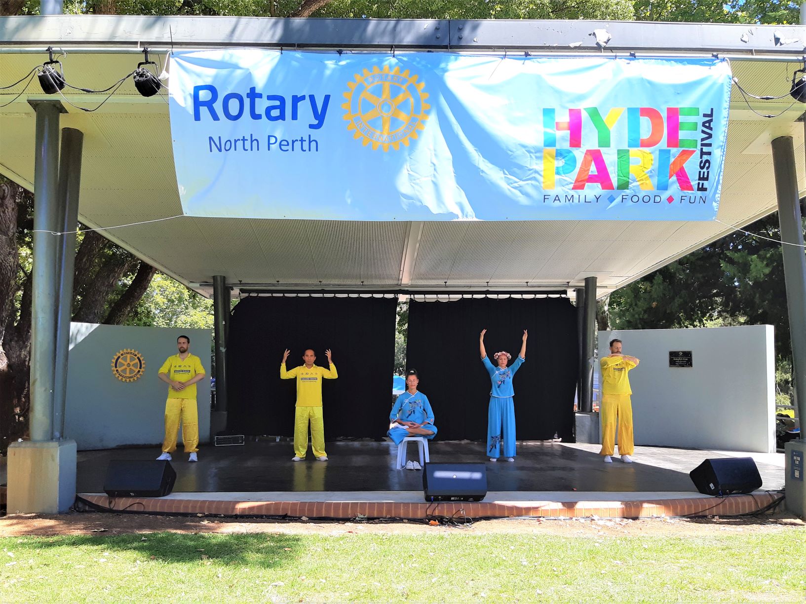 ![]() 图5:西澳法轮功学员在海德公园节舞台上向观众们演示法轮功五套功法。 |