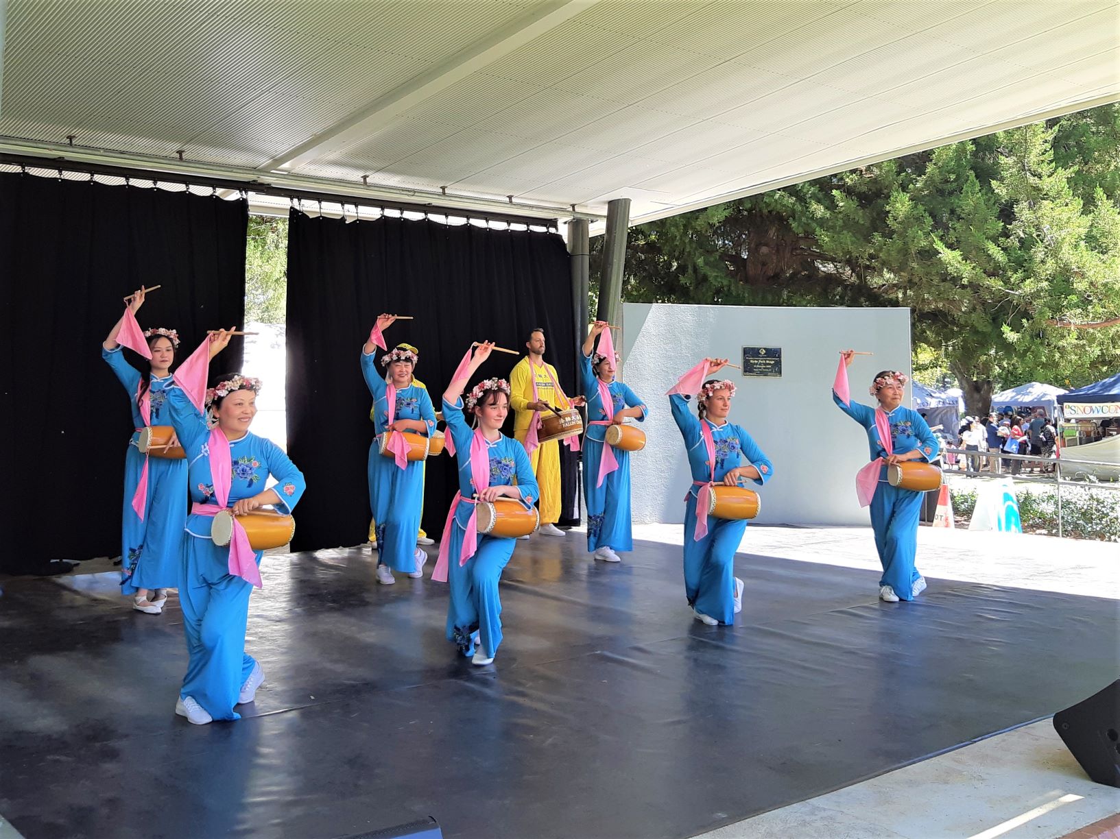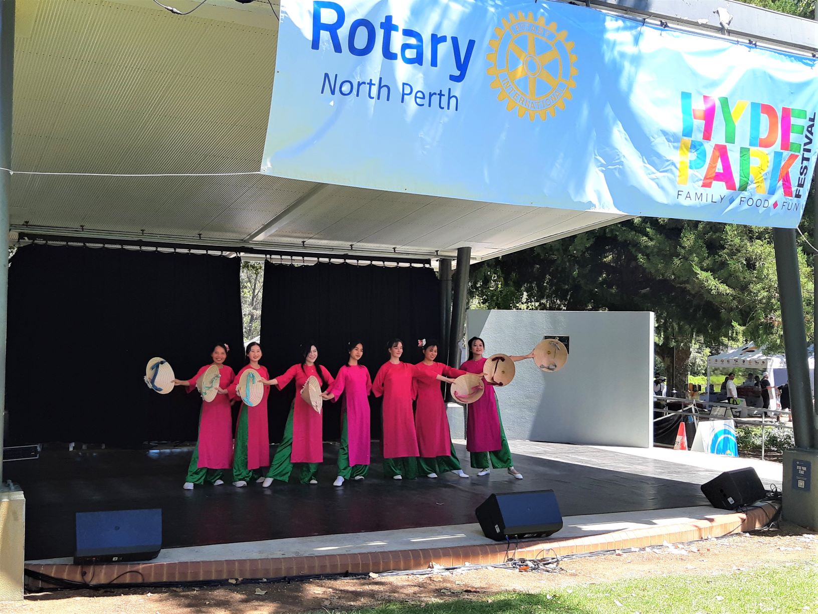 ![]() 图6:西澳法轮功学员在海德公园节舞台上表演越南斗笠舞。 |