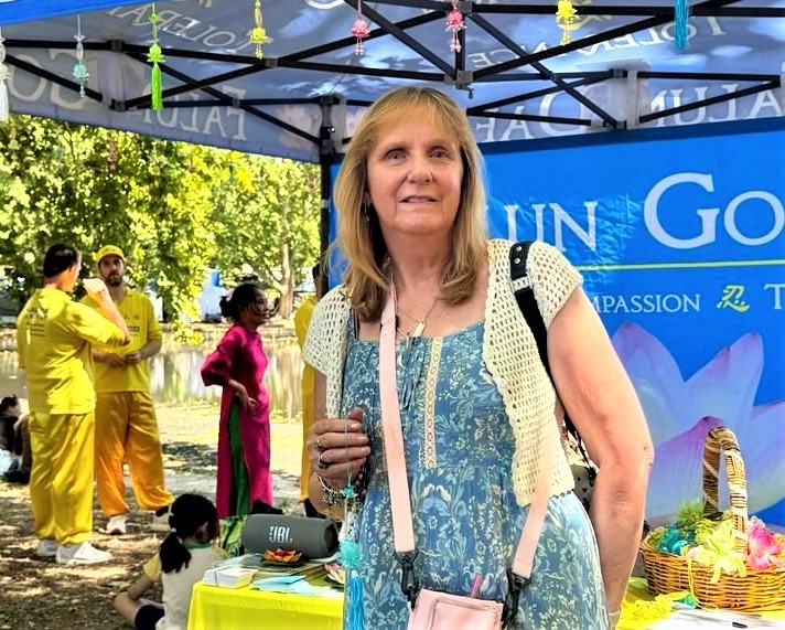 黛比·伯顿肖尔(Debbie Burtonshore)看到学员们在展位上演示第五套功法——神通加持法,感到特别祥和。她非常赞同法轮大法真、善、忍法理。她说:“世界绝对需要她。可悲的是,我们这个世界相当缺乏这些。”了解到法轮功学员遭受的迫害,她表示将回家阅读资料,了解更多有关法轮大法的信息以及中共迫害法轮功的罪行。
