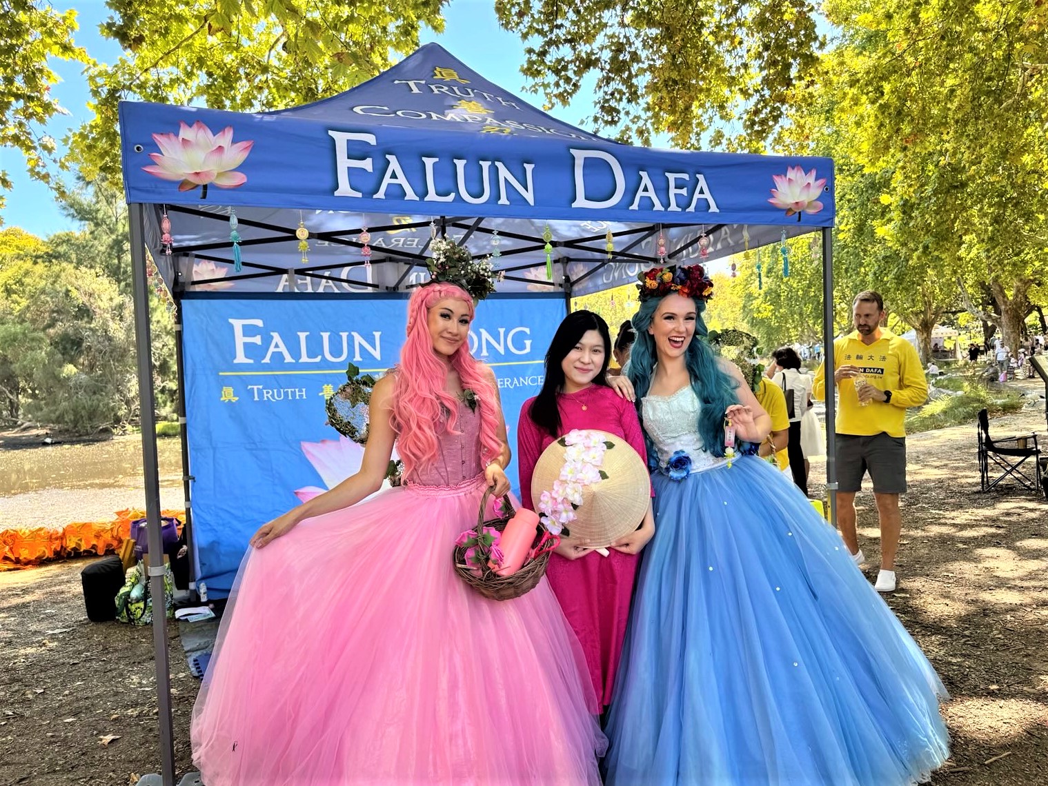 两位打扮成仙女的女子来到法轮大法展位,她们表示很喜欢展位的主题和色彩,并一致表示法轮大法真、善、忍非常棒。
