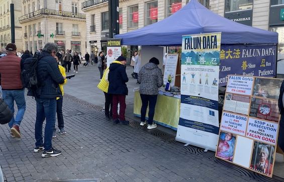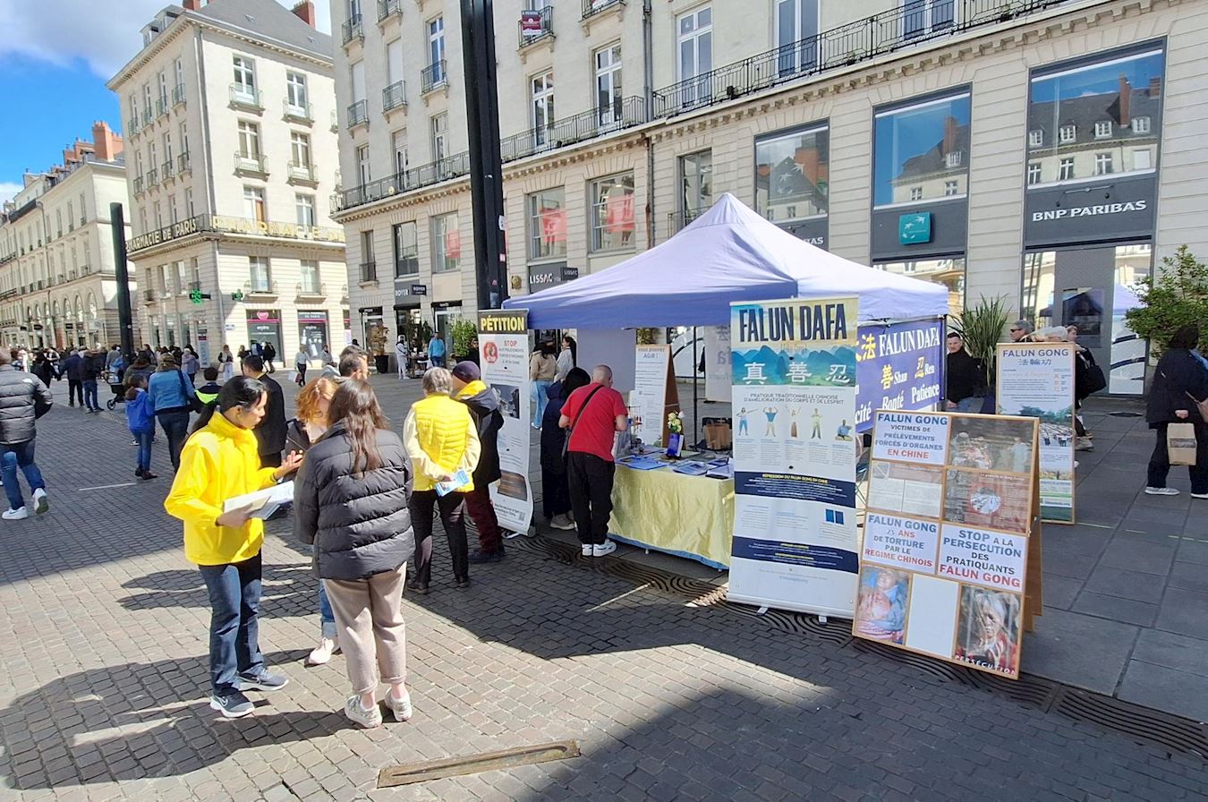 【明慧网二零二五年四月一日】二零二五年三月二十九日星期六,法国南特市(Nantes)举办了大型旧货市场。在皇家广场的黄金位置,法轮功学员设立了一个信息台,向民众介绍法轮功,揭露中共对法轮功修炼者的迫害
