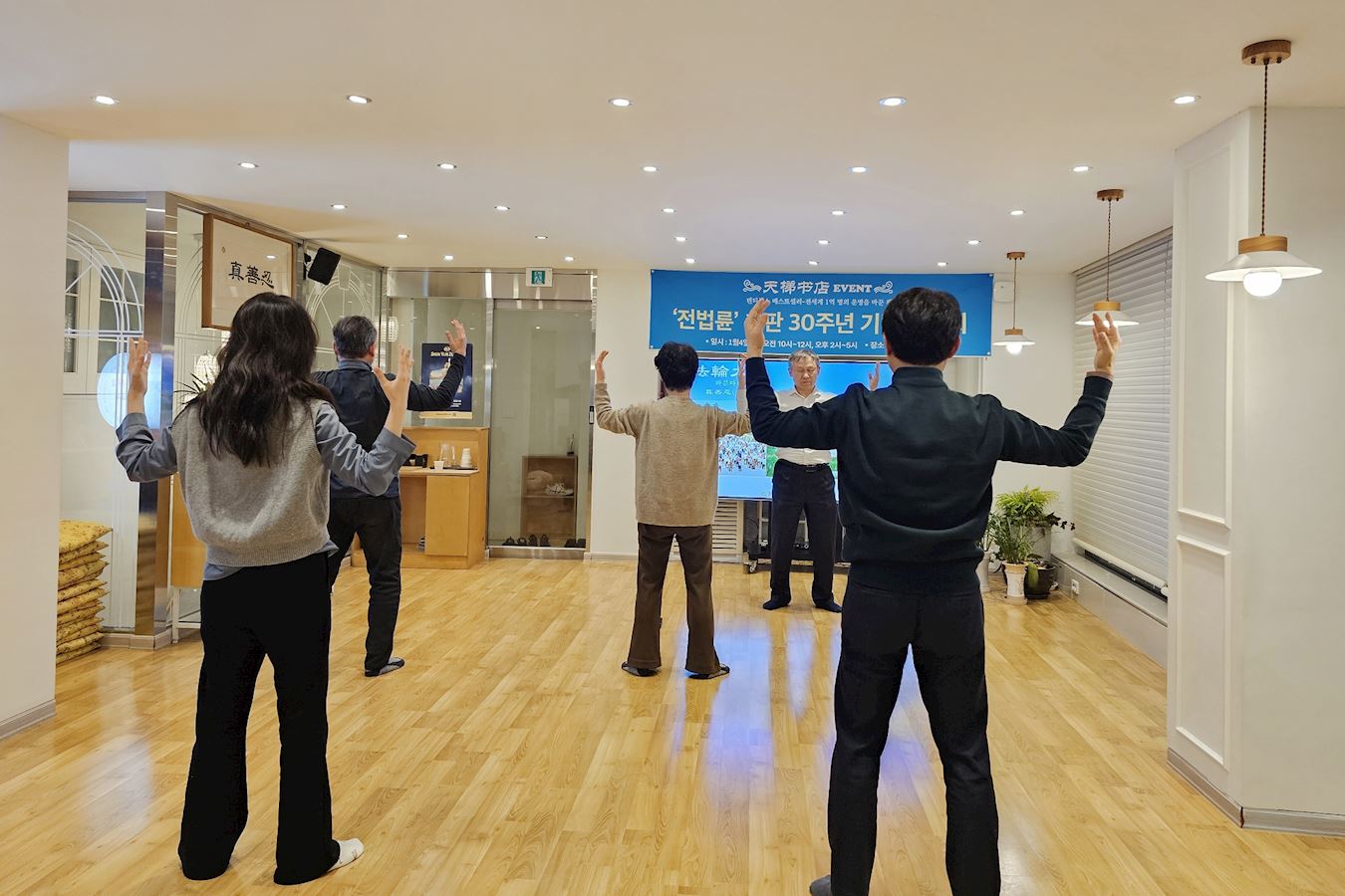 ![]() 图1:参加首尔天梯书店法轮大法二月份“九天学习班”的新学员们在学炼法轮功第二套功法“法轮桩法”。 |