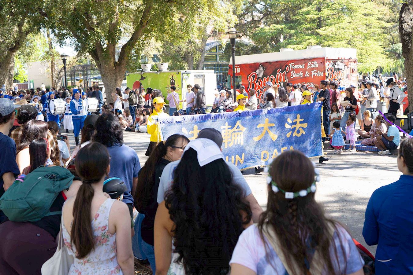 法轮功学员的队伍经过大学城位于北阔德大道(North Quad Ave)主席台时,主持人介紹道:“现在过来的队伍是法轮大法天国乐团,天国乐团的英文意思是来自天国的乐团。法轮大法是基于真、善、忍原理的修炼,包括五套功法。并祝大家‘野餐节’愉快。”