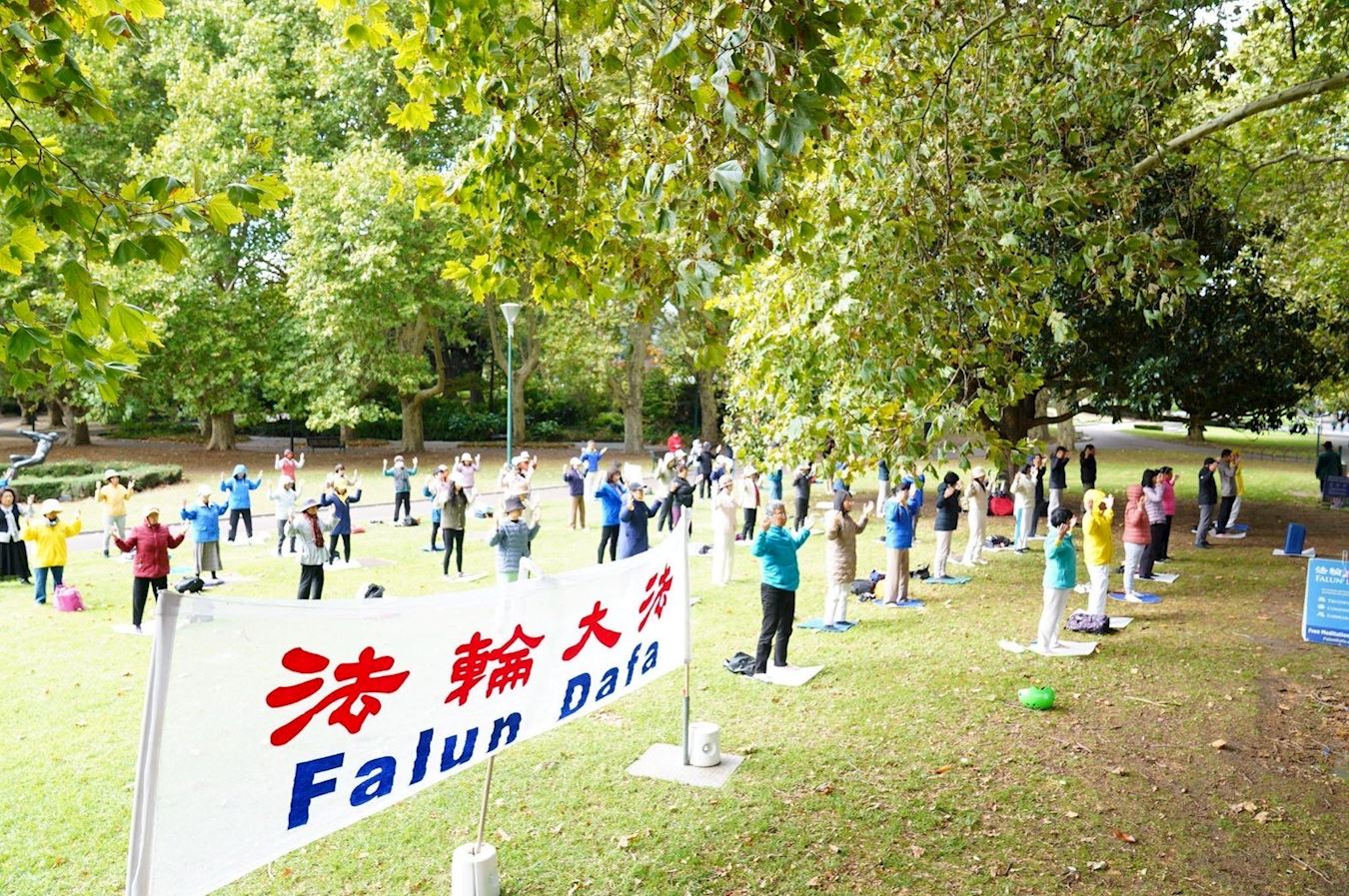 二零二五年四月六日,墨尔本市中心举行的“为孩子而跑”(Run for the Kids)慈善长跑活动,每年都吸引了数万名跑步爱好者和慈善支持者。位于市中心的维多利亚女王公园(Queen Victoria Gardens),在长跑选手必经的大路旁。数十位法轮功学员从清晨开始,随着悠扬的音乐集体炼功。