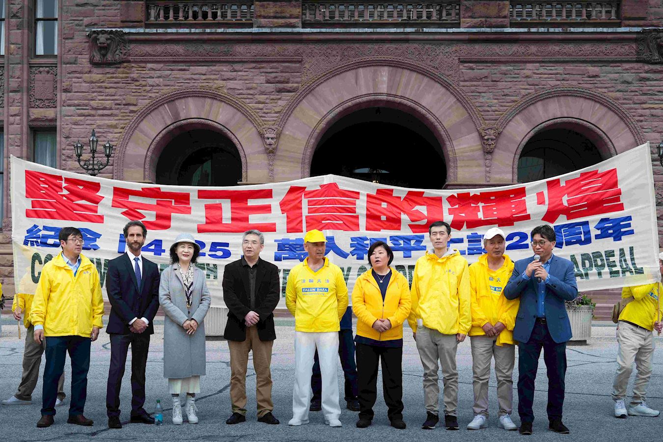 中国民主党加拿大委员会成员张科女士也到场支持,她说:“民主党成员今天来参加法轮功的这次集会。为什么我要来?因为中共迫害法轮功是从二十六年前的四月二十五日法轮功和平大上访,万人和平大上访开始的。活摘器官是从迫害法轮功学员开始的。我们今天站在这里就是要坚持支持法轮功。法轮功是正义的!是善良的!是美好的。真、善、忍是法轮功的修炼法理。法轮大法好!”