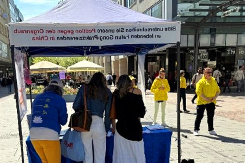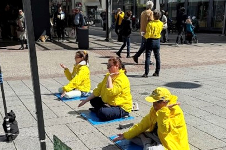 当天,阳光明媚人流如织,许多人都在城市里活动。法轮功真相信息台前,一部分学员向市民演示法轮大法的五套功法,一部分学员向路人发放真相资料,跟他们讲述法轮大法的美好,同时揭露中共惨无人道的活摘法轮功学员器官的罪行。