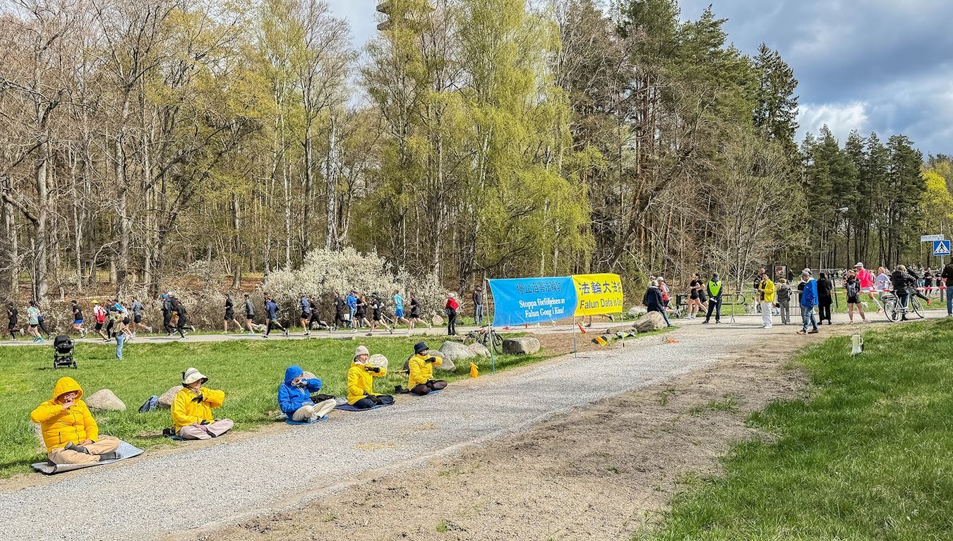 当天正值斯德哥尔摩举办阿迪达斯半程马拉松赛,学员们的活动现场是马拉松参赛运动员的必经之路,过往的交通车辆均受到了影响,但路上的行人很多。当人们目睹了醒目的横幅以及学员们那宁静祥和炼功场面时,许多参赛者是边跑边举起手、竖起大拇指,朝着学员挥舞着。还有不少过往的路人和当地居民主动上前和学员交谈,很多人明白真相后,都很愿意用签名来表示支持法轮功学员的反迫害,临走时还向学员双手合十以表敬意。
