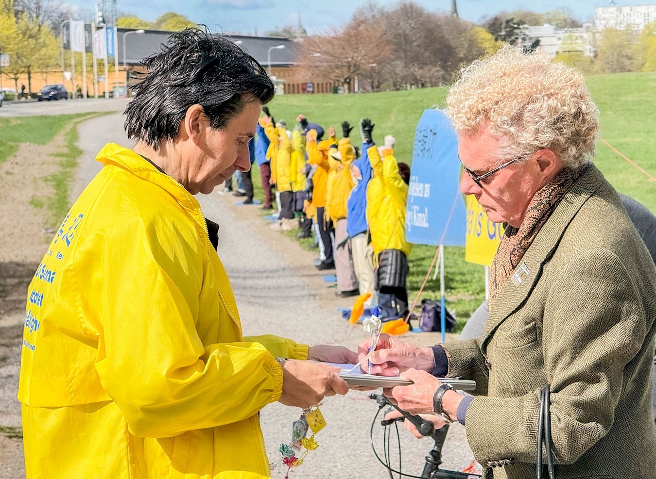 其中一位瑞典先生签完了字后,他告诉学员:“我就住在附近,每年的这个时候中使馆的人都在院子里用高音喇叭播放歌曲(噪音),这不仅干扰你们,因为声音传的很远很远、更是严重的扰民。据我所知,当地居民已向瑞典有关部门投诉,今天我就是过来看看(中使馆)是否有所收敛。”他谈到,他曾在香港、意大利很多国家都工作过,对于中共体制内的现状还是比较了解。他认为,“法轮功学员做得非常好”。