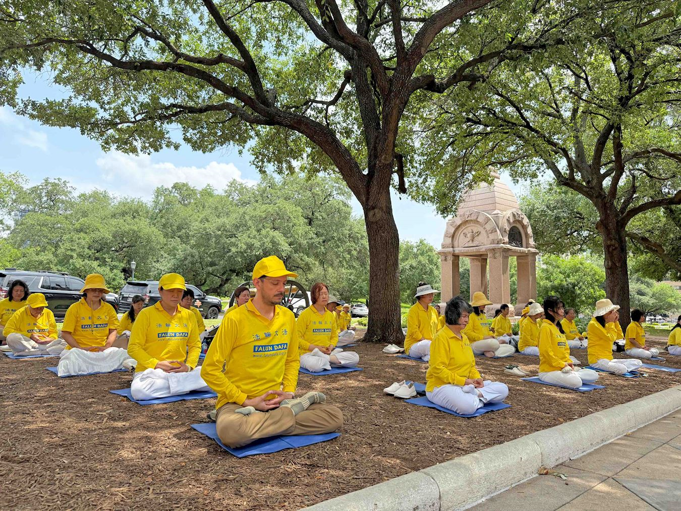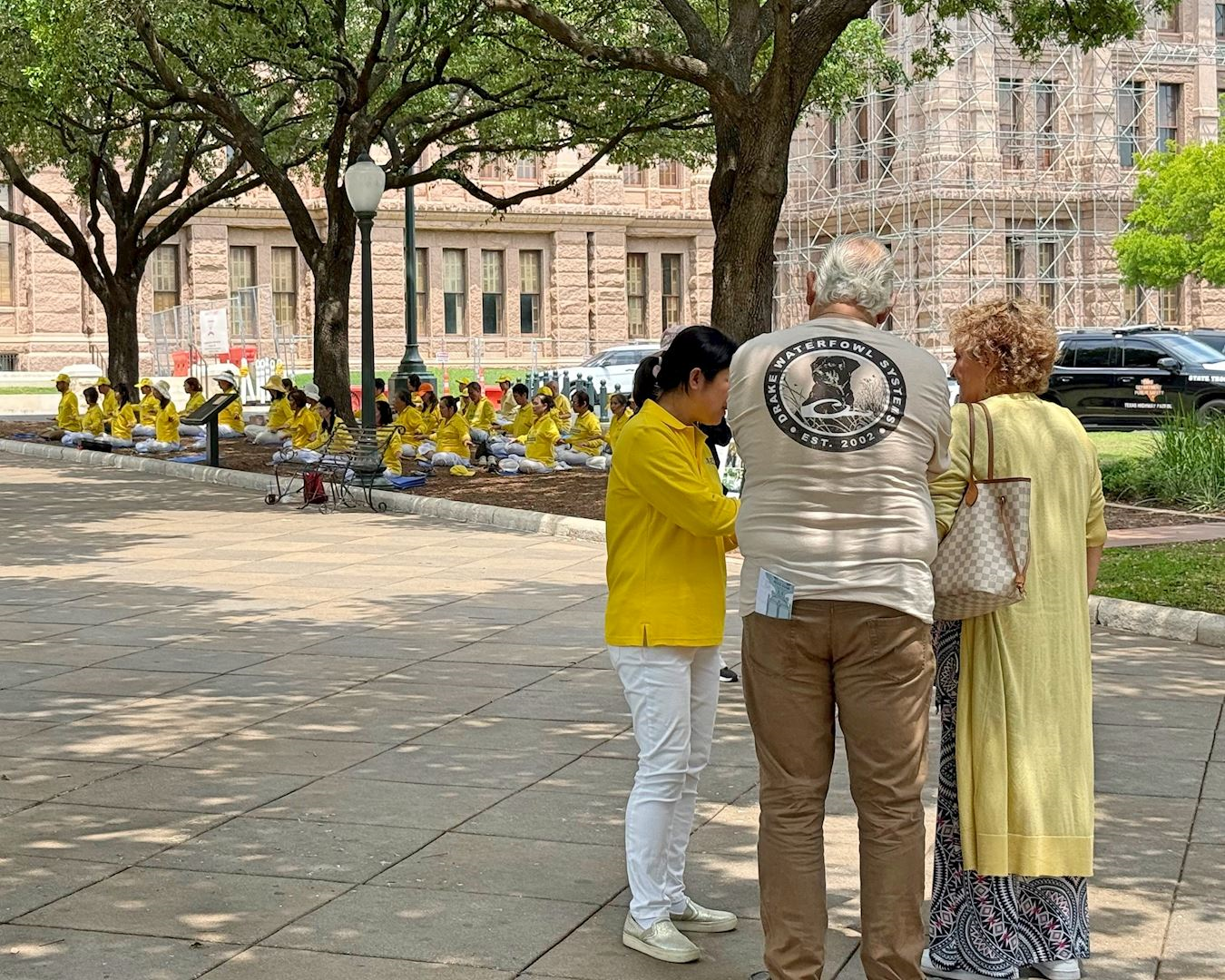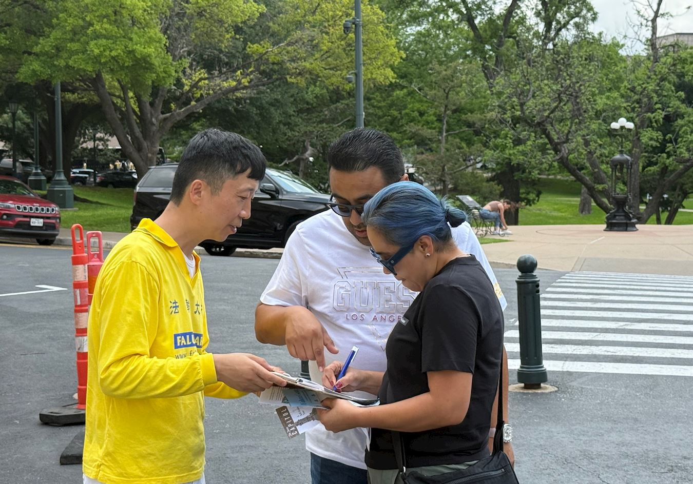 奥斯丁本地人马修(Matthew)在议会大厦附近骑单车,看到有活动,过来与法轮功学员交谈。他因家里人曾有人到过中国传教,所以他知道中共不容忍那些信仰,或传授与其共产主义意识形态不同的人,甚至它还篡改圣经。马修说他对打坐非常感兴趣,法轮功让他非常有共鸣。在他发现奥斯丁的炼功点离他家很近时,很高兴,他想学习法轮功。