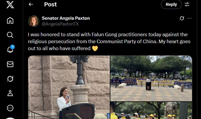 安吉拉‧帕克斯顿(Angela Paxton)是德克萨斯州第八选区的州参议员,在当天集会上发言中,她说自己选区的法轮功学员来到她办公室与她见面,让她听到了他们的经历——什么是法轮功以及他们自己、家人、朋友在中国大陆的遭遇,抓捕、酷刑、甚至可能被活摘器官。中共的这种发指的恶行,对她来说难以想象,却是真实的存在。