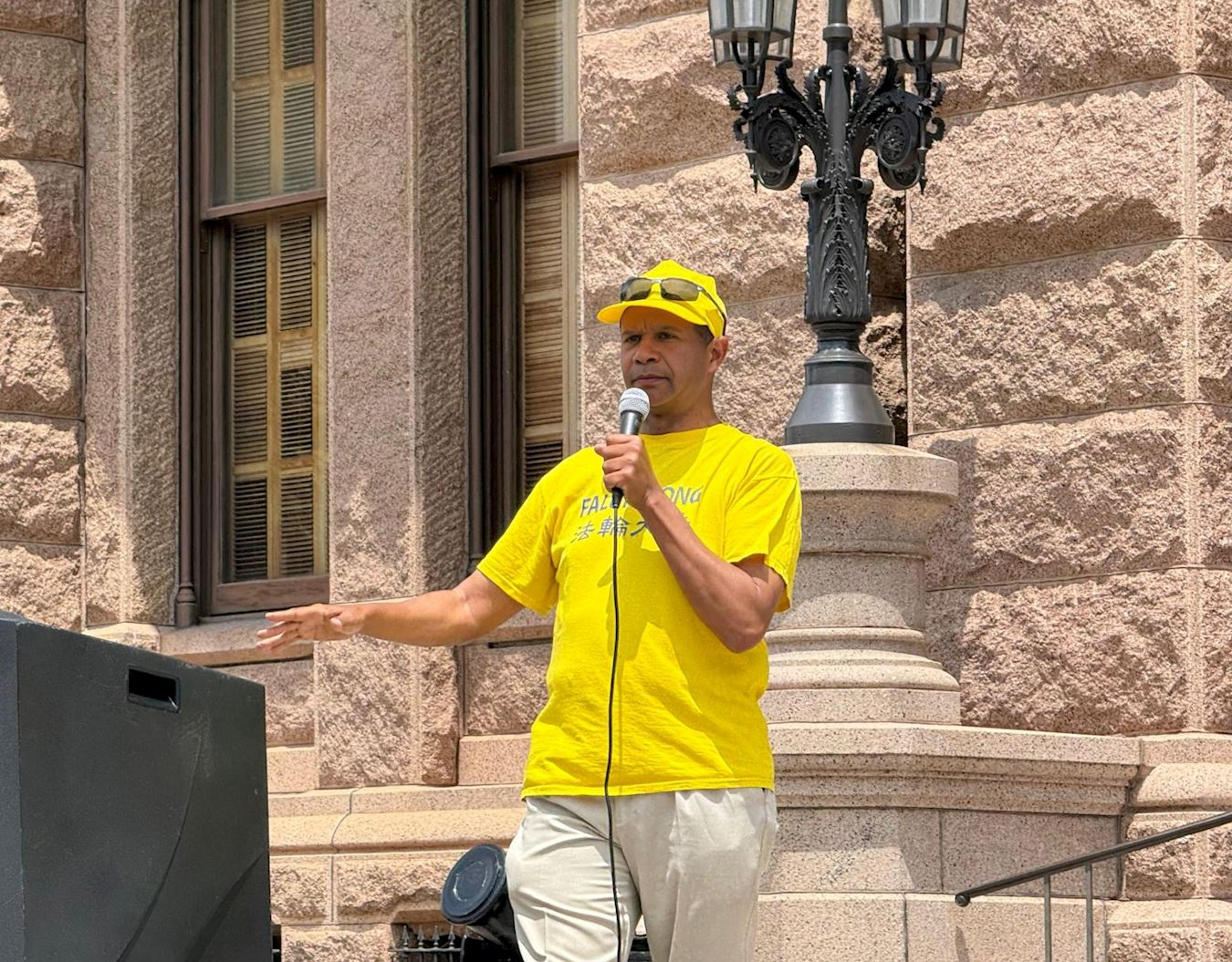活动主办方美南法轮大法学会会长肖恩∙杨(Sean Yang)首先发言,他指出法轮功学员一九九九年四‧二五的和平上访,却遭中共后来残酷的迫害。在这长达二十六年的迫害中,数以万计的法轮功学员在中共的看守所或劳教所中被迫害致死,连许多年逾八旬的老年学员也未能幸免入狱。更令人震惊的是,法轮功学员是在中国大陆活摘器官罪行的主要受害群体。