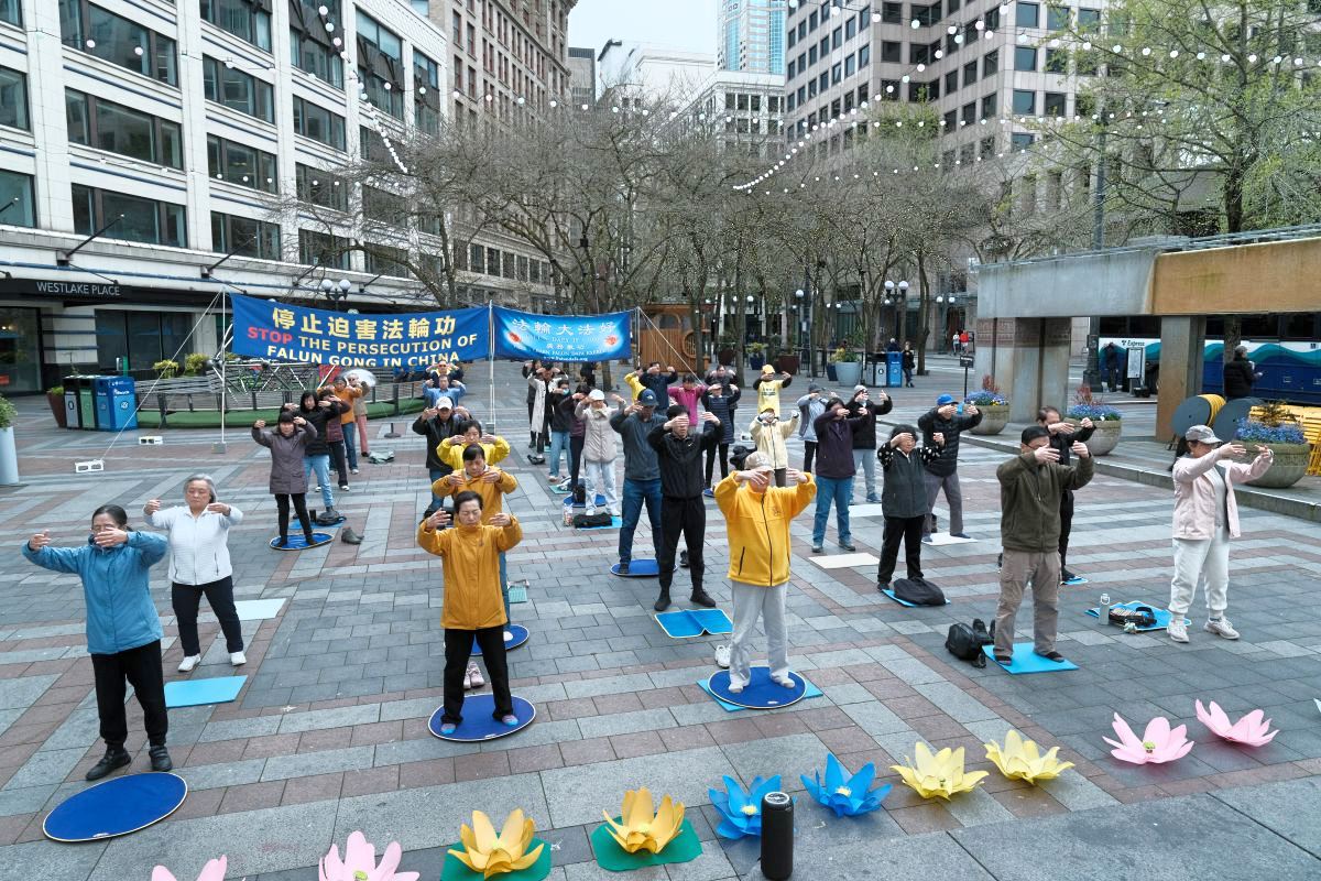 ![]() 图1~2:二零二五年四月二十日,法轮功学员在西雅图市中心的西湖公园(Westlake Park)炼功,纪念“四・二五”法轮功和平上访二十六周年。 |