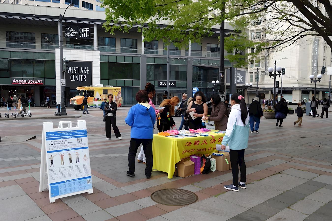 当天,法轮功学员在公园的广场上展示法轮功的五套功法,在喧嚣的西雅图市中心构成一道独特的风景线。许多路人好奇地驻足观看,有的人和法轮功学员交谈,有的人仔细阅读学员们在旁边放置的法轮功真相展板。