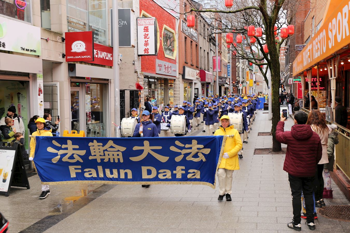下午一点,由法轮大法天国乐团和真相横幅方阵组成的游行队伍,从市中心凯博广场(Cabot Square)出发,沿着圣凯瑟琳大街和赫内·列维斯克大街等市中心主要干道行进,穿过唐人街,终点抵达艺术中心广场。