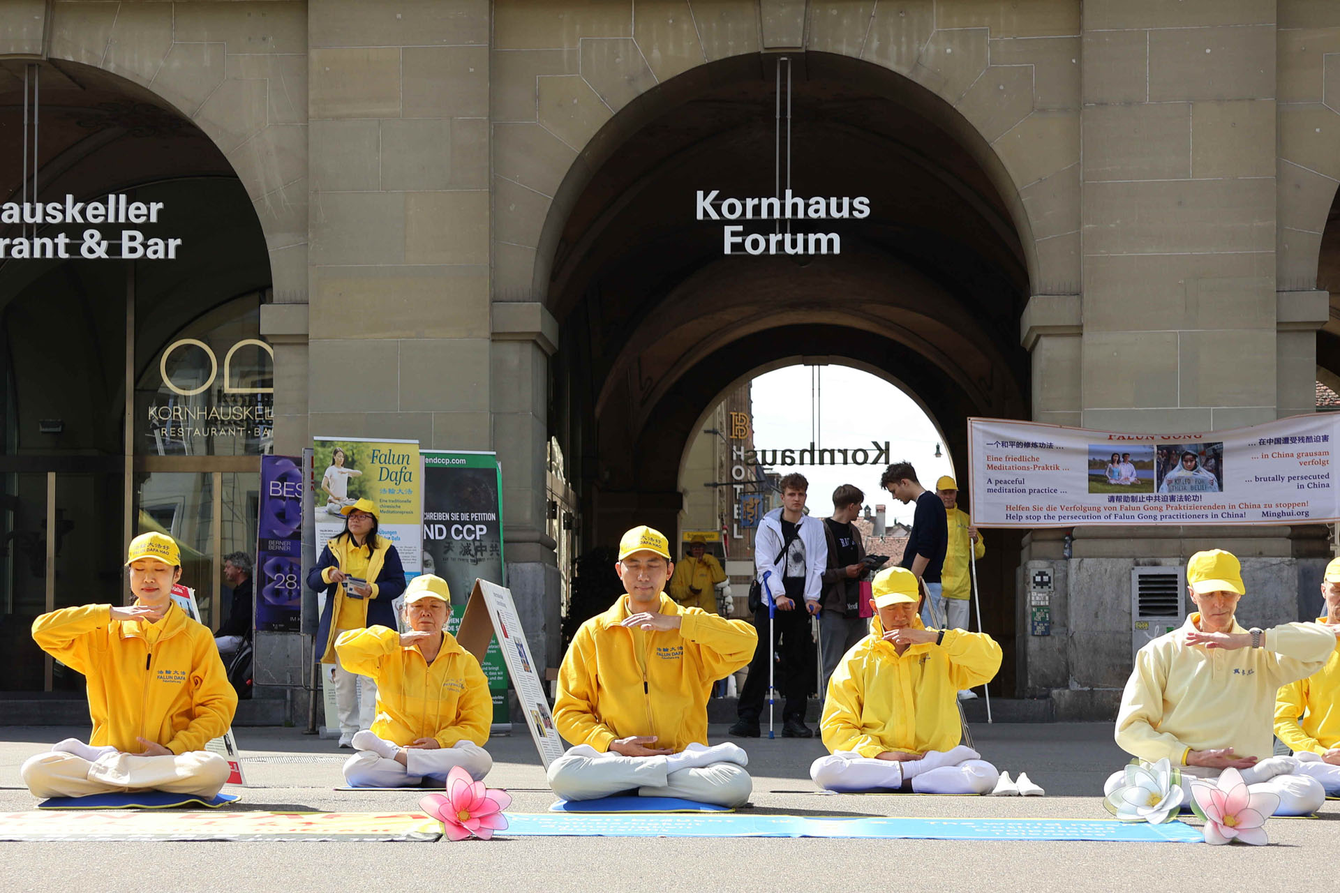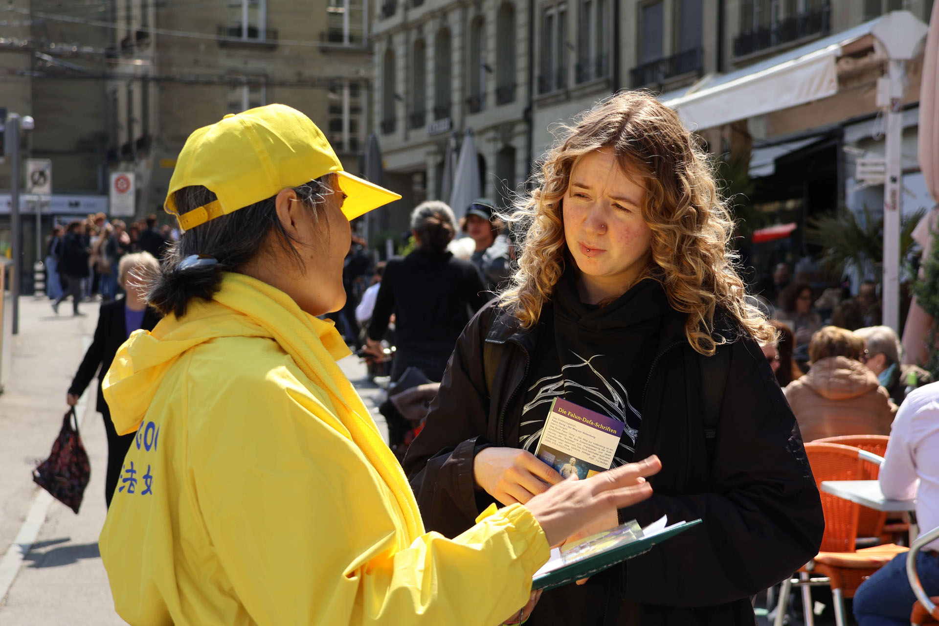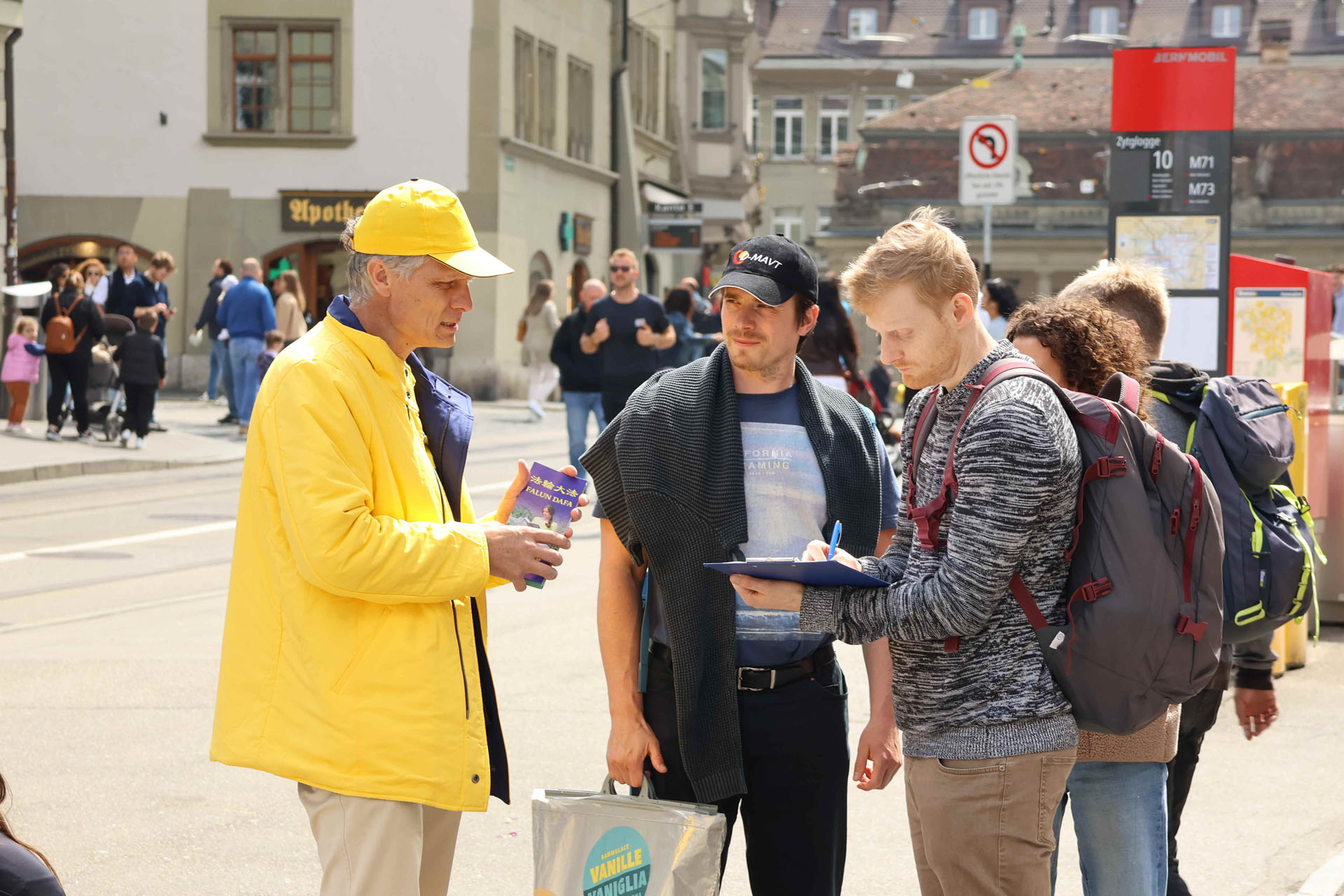 二零二五年四月二十六日下午,法轮功学员再次来到伯尔尼市(Bern)中心,向人们讲述二十六年前让世界惊叹的万人上访的故事,及随后中共的所为。路人有的静静聆听学员们的演讲,有的仔细阅读讲述法轮功故事的真相展板,有的和学员们长时间交谈,了解更多讯息。