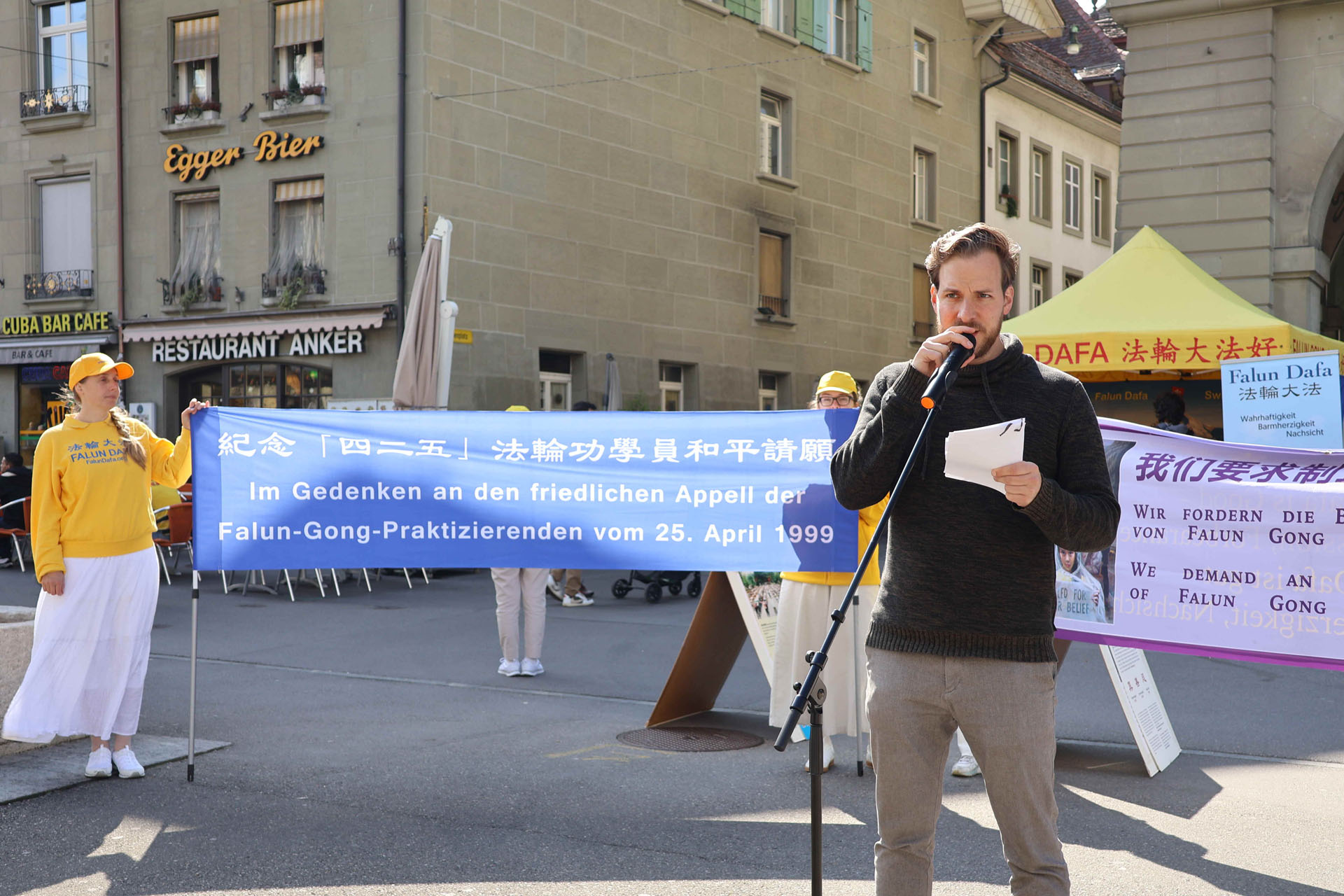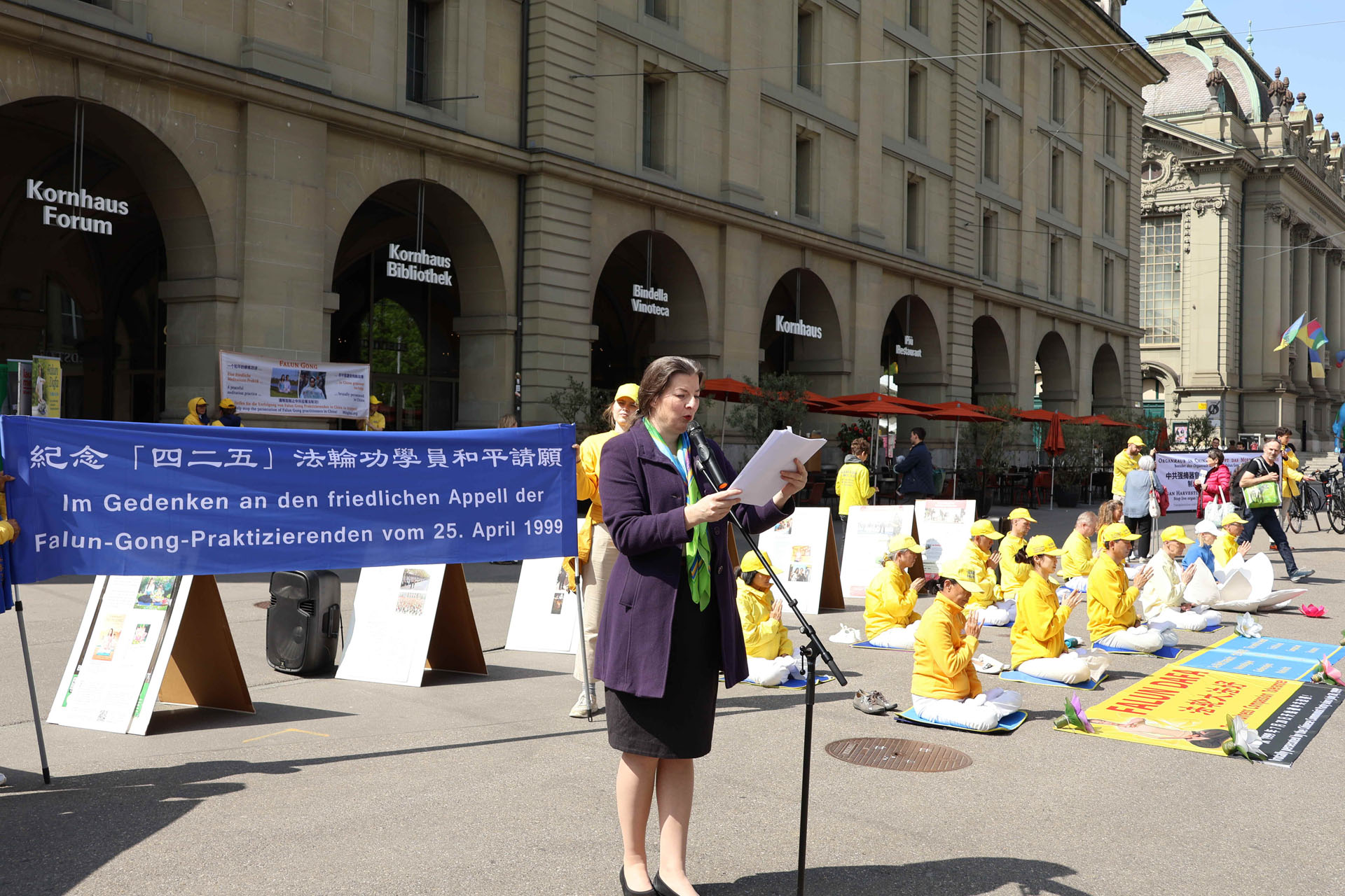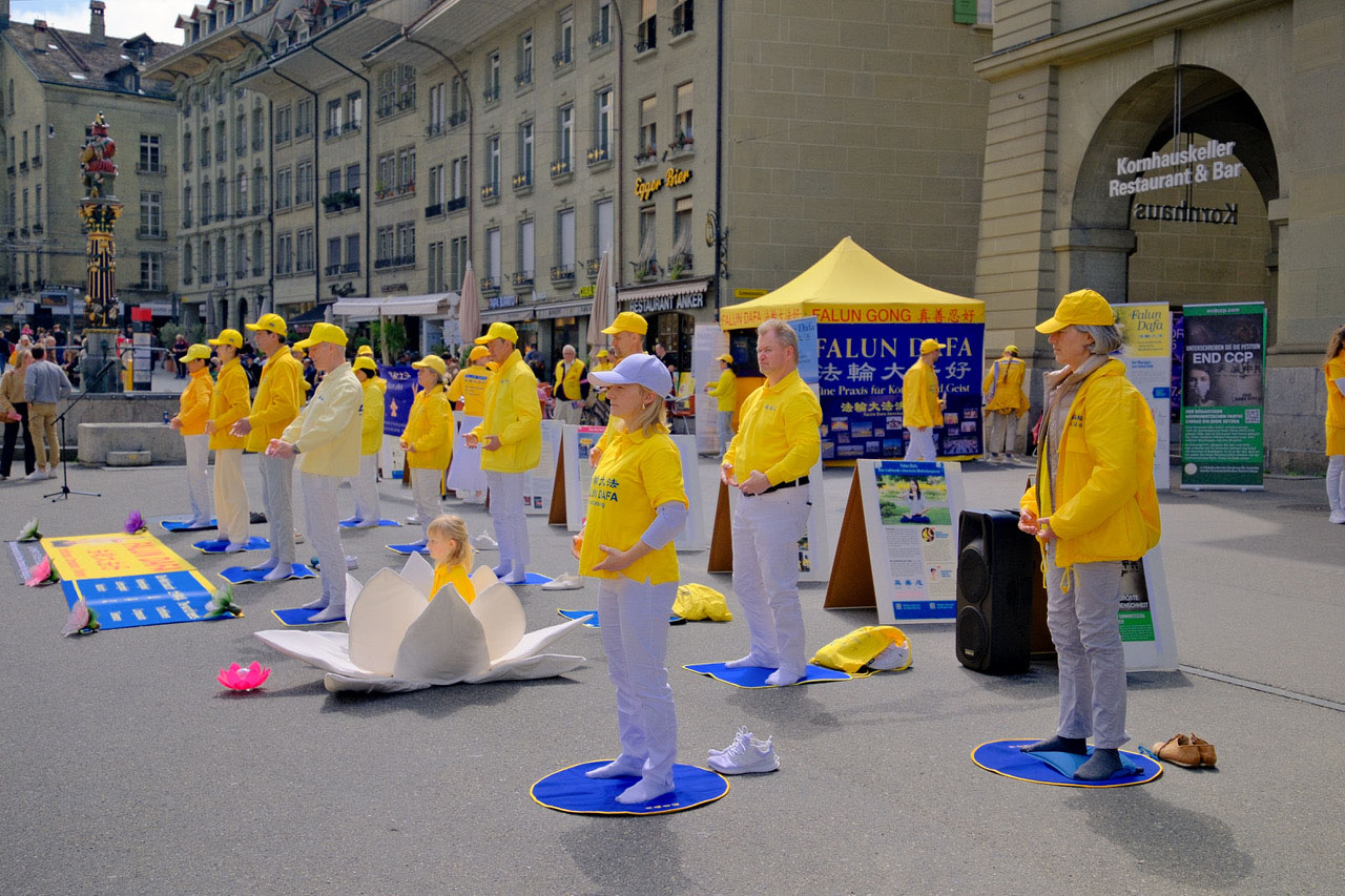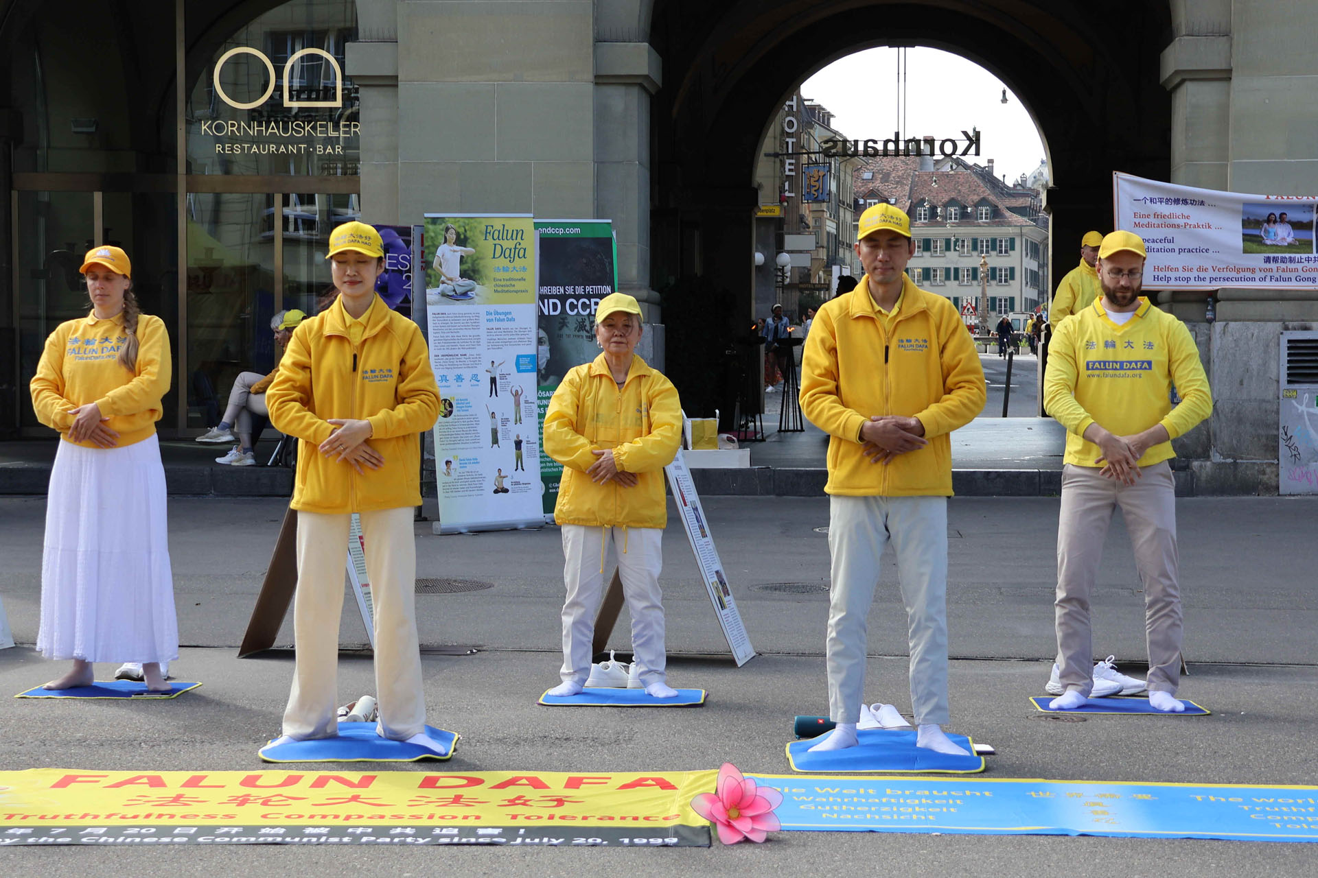 二零二五年四月二十六日下午,法轮功学员再次来到伯尔尼市(Bern)中心,向人们讲述二十六年前让世界惊叹的万人上访的故事,及随后中共的所为。路人有的静静聆听学员们的演讲,有的仔细阅读讲述法轮功故事的真相展板,有的和学员们长时间交谈,了解更多讯息。