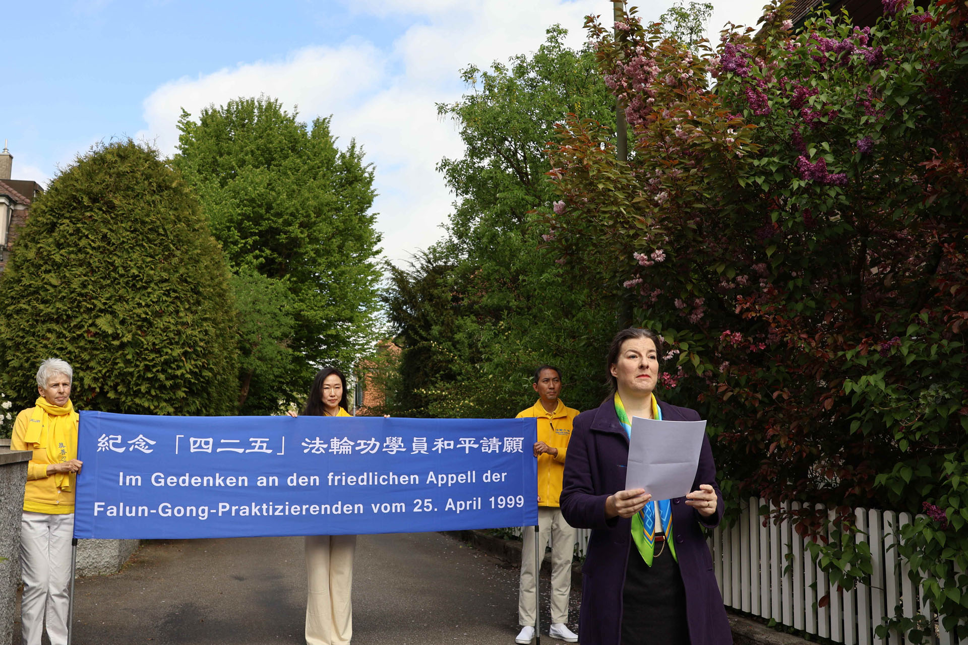 图4:法轮功学员在中共伯尔尼使馆前宣读中文及德文的劝善信,希望他们能作出对自己负责的决定