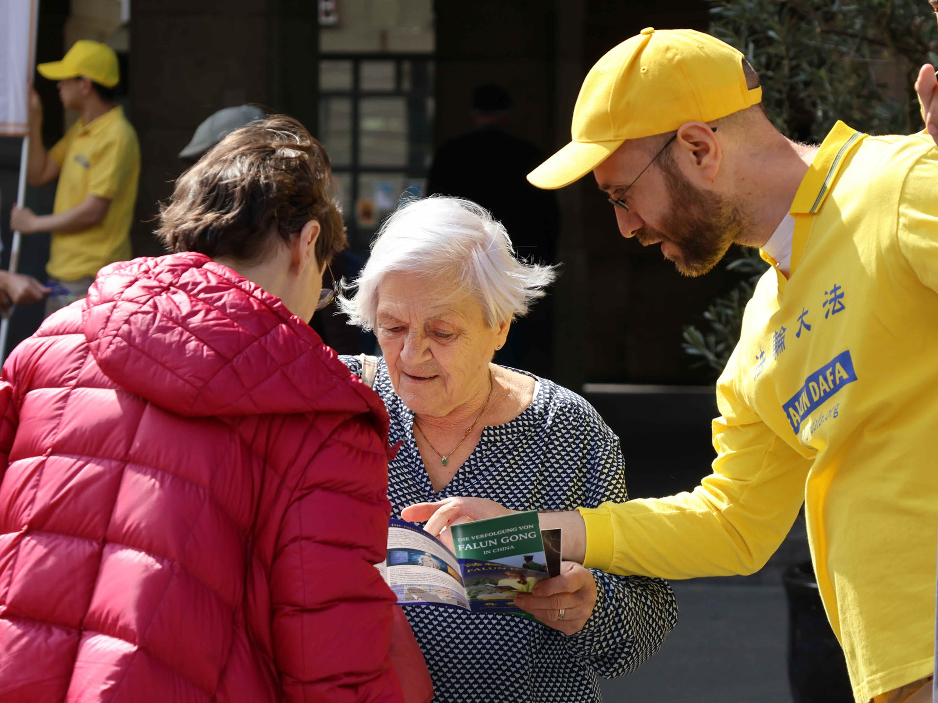 活动当天,有些路人对此已有所了解,所以径直签名要求制止迫害。一位女士在签名后说:“法轮功来自中国,在世界各地都能够修炼,却在发源地被禁止,被非法关押,甚至被活摘器官,这实在是太让人伤心了。”