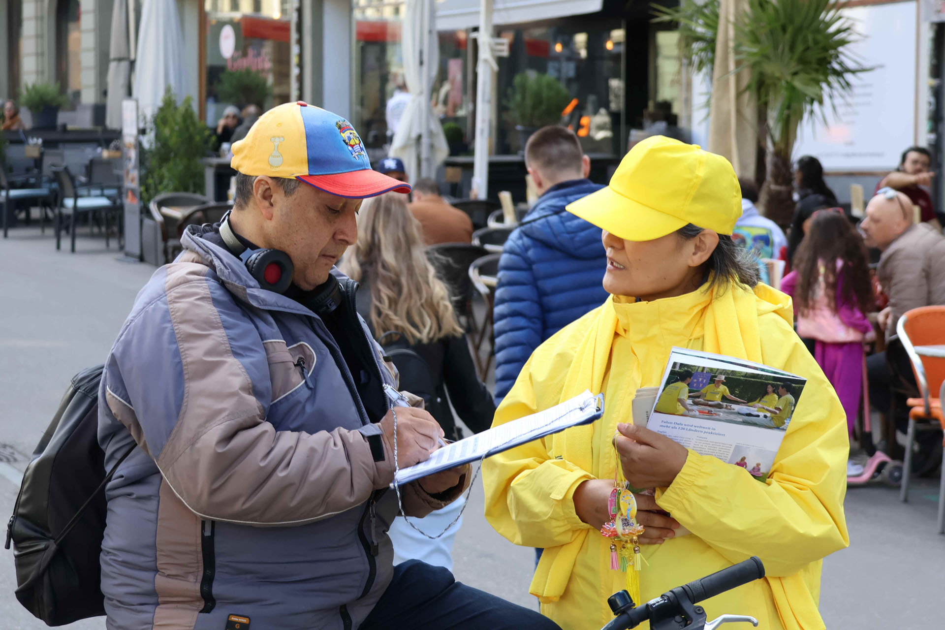 他们纷纷签名支持法轮功学员。赫特尔希望:“能够送上我的一份小小的支持, 希望能够停止迫害,让这些人(法轮功学员)能够自由的炼功。”