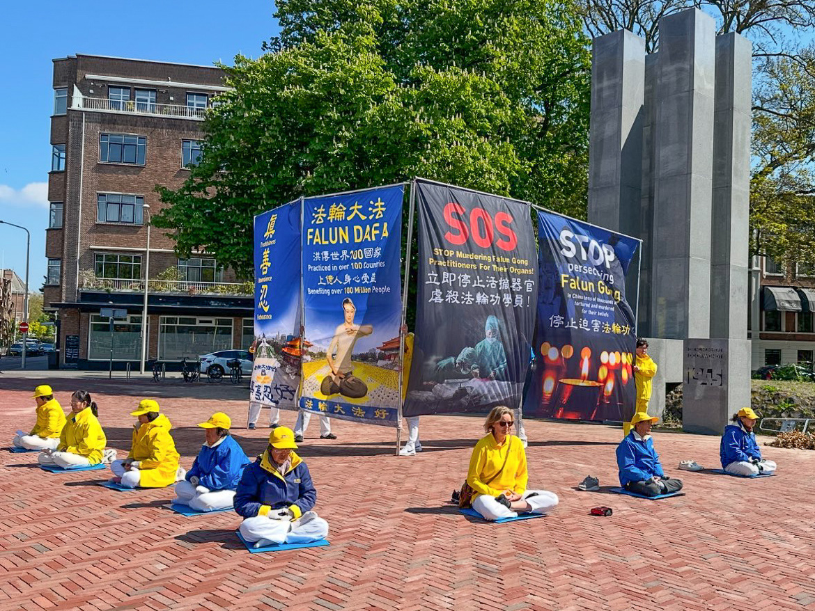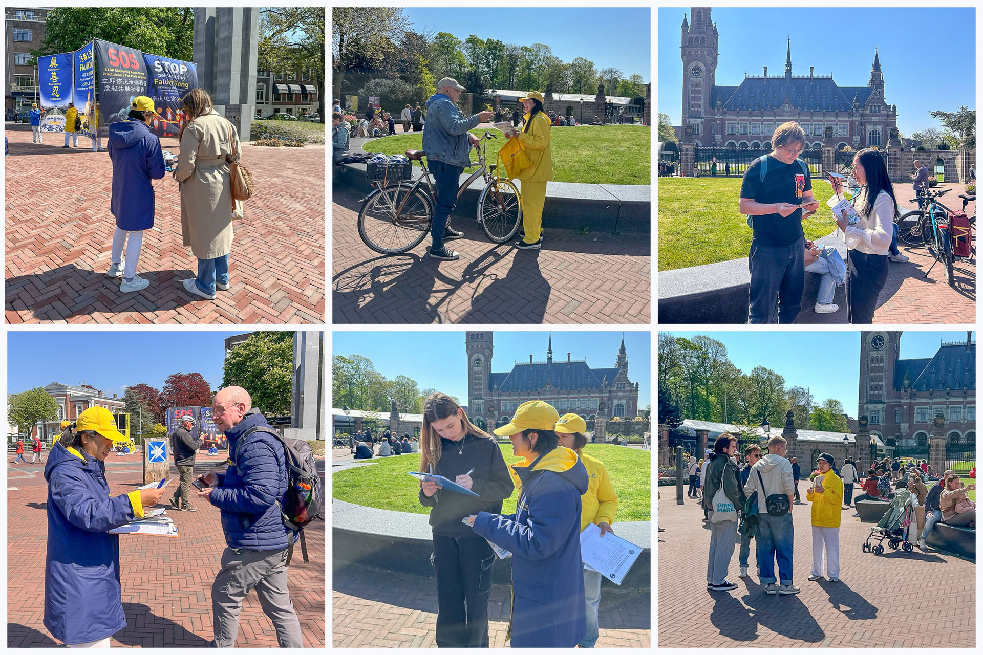 四月二十五日下午,荷兰法轮功学员分别在海牙市中心大市场街(Grote Marktstraat)和海牙和平宫景点设立展板和横幅,现场展示法轮功功法,有的学员以征签的方式对民众讲述真相。
