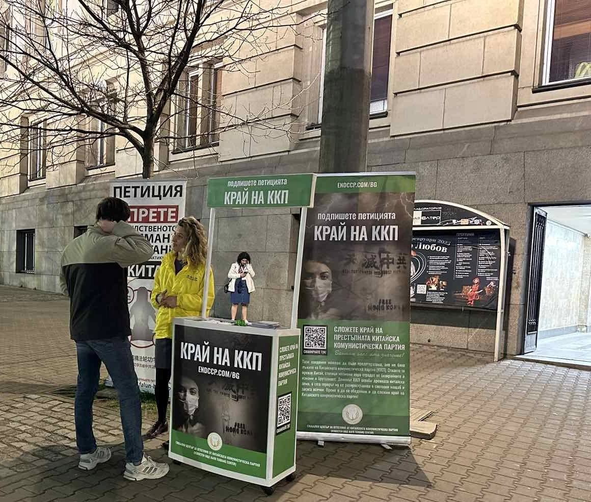 在索菲亚大学校园内,法轮功学员在入口处摆放了信息展板和请愿书签名台。许多路过的年轻人对信息台展出的真相产生兴趣,主动驻足了解更多信息。