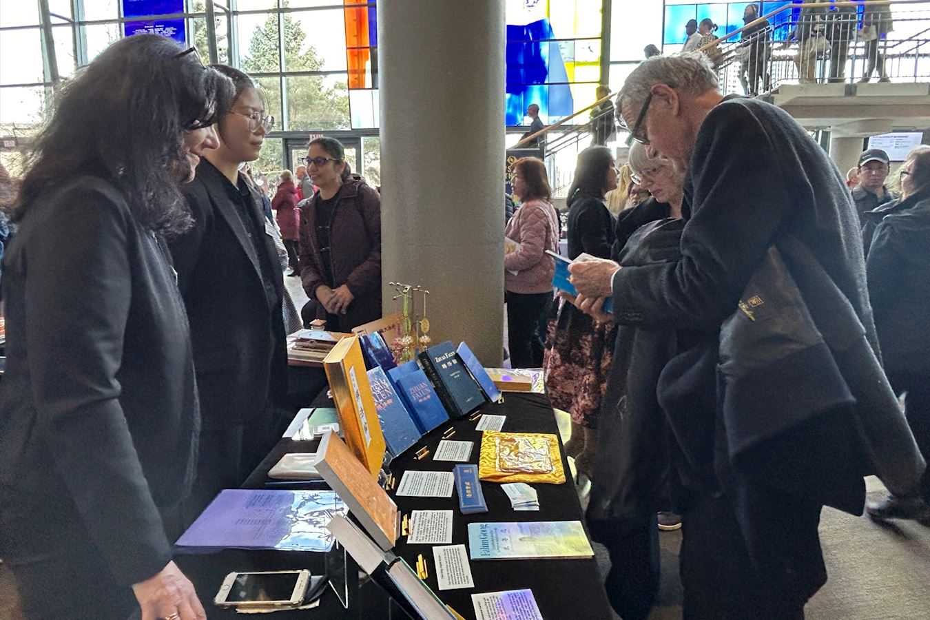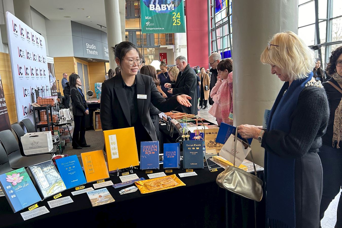 【明慧网二零二五年四月九日】(明慧记者章韵综合报导)神韵八个团目前在全球同步巡回演出,观众为神韵的艺术成就惊叹不已,更为神韵传递的神性和强大的能量所震撼和感动,不少观众聚集在剧院大厅的法轮大法(又称法轮功)书籍展位索取简介传单、购买大法书籍,希望更多了解法轮功、学习法轮功。