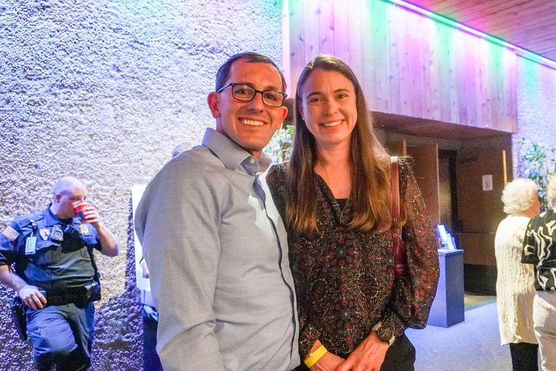 '图6:二零二五年三月二十六日晚,美国一家公司的财务总监达伦·史密斯(Darren Smith) 和太太观赏了在夏安市的神韵演出。中场休息期间,他们在法轮大法书籍的展位前排队准备购买。(大纪元)'