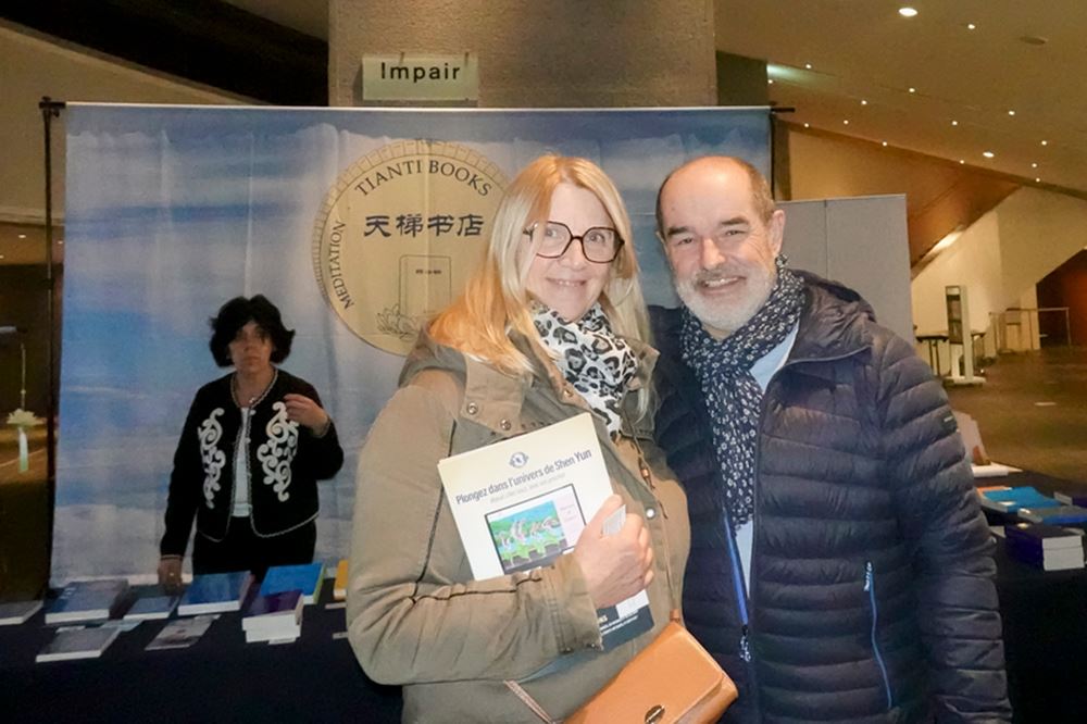 '图7:二零二五年二月十八日晚,市府绿化部的前主任伊夫·盖特(Yves Gaté)与太太安妮·盖特(Annie Gaté)在法国南特市观赏了神韵演出后,在法国天梯书店的展位上购买了法轮大法书籍。(大纪元)'