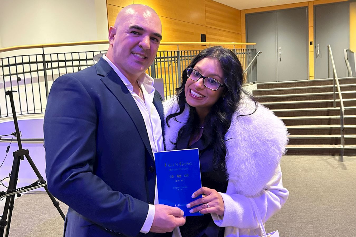 '图9:二零二五年三月二十一日晚,移民顾问卡姆‧卡皮佐拉(Cam Capizola)和男友彼得‧卡雷罗(Peter Carreiro)在加拿大密西沙加观赏了神韵演出。演出结束后,两人直接来到法轮大法书籍展位,购买了一本《转法轮》。(大纪元)'