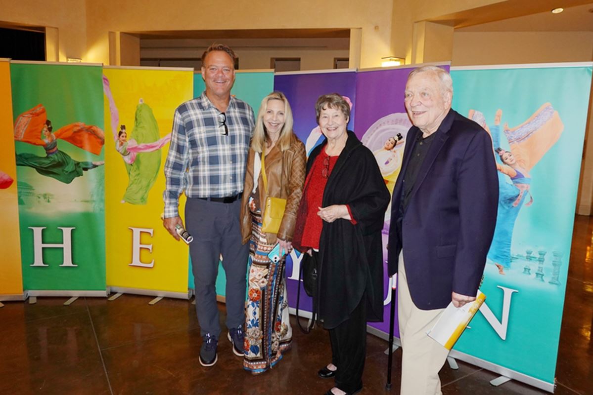 图10:二零二五年三月十八日晚,连锁公司创建人鲍勃·克劳斯(Bob Krause)和太太及父母在美国加州艾斯康迪都观赏了神韵演出。克劳斯的母亲在现场购买了法轮功书籍。(大纪元)