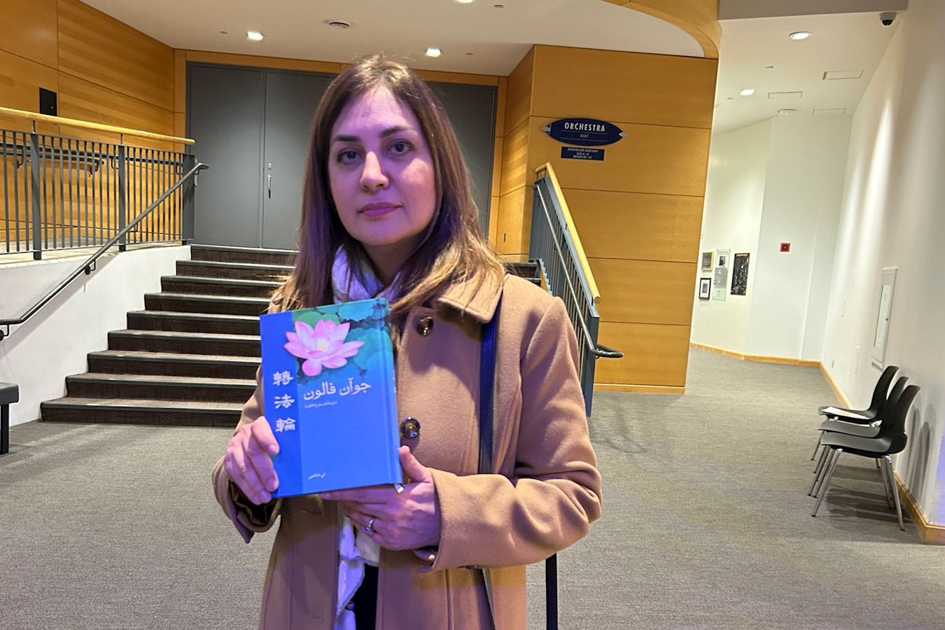 '图11:二零二五年三月二十二日晚,加拿大约克大学兽医博士后研究员米娜(Mina H),观赏了神韵在加拿大密西沙加市的演出,现场购买了一本《转法轮》。(大纪元)'