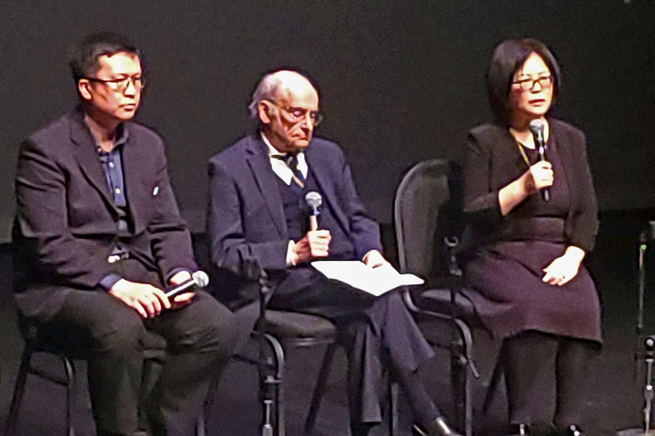'图1:导演章勇进(左)、著名人权律师戴维·麦塔斯(David Matas,中)和制片人Cindy Song(右)在放映会上回答观众提问。(大纪元)'