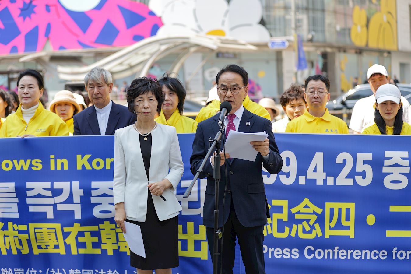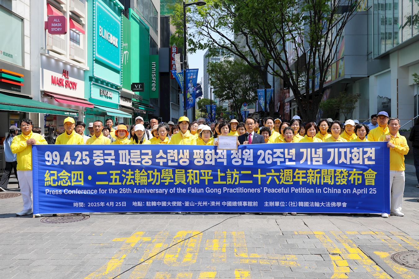 ![]() 图1~2:二零二五年四月二十五日,韩国法轮功学员在首尔明洞驻韩中共大使馆前召开纪念四·二五和平上访二十六周年记者会。 |