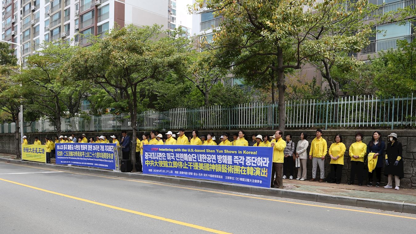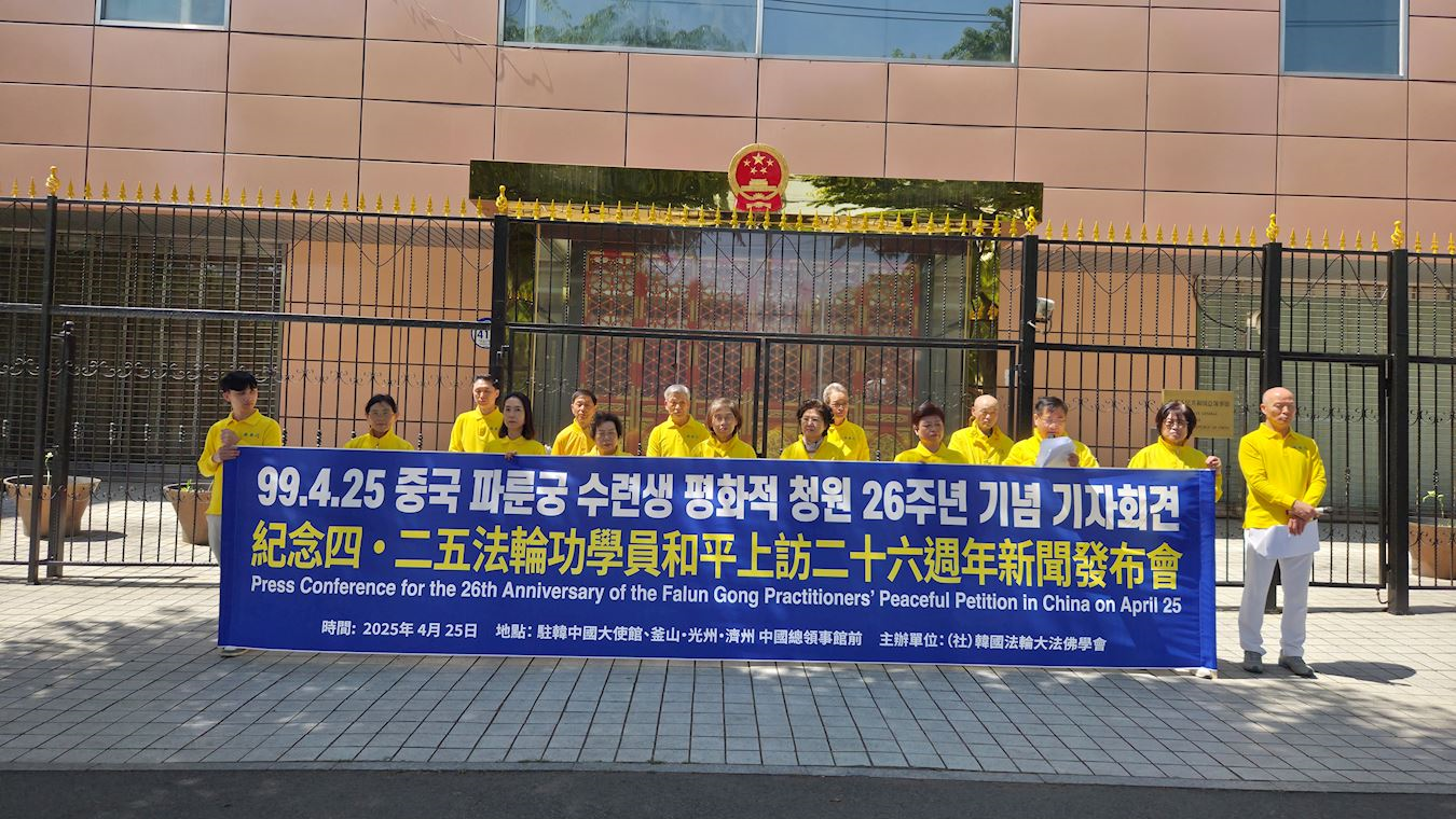 ![]() 图4:二零二五年四月二十五日,韩国法轮功学员在驻韩中共光州总领馆馆前召开纪念四·二五和平上访二十六周年记者会。 |