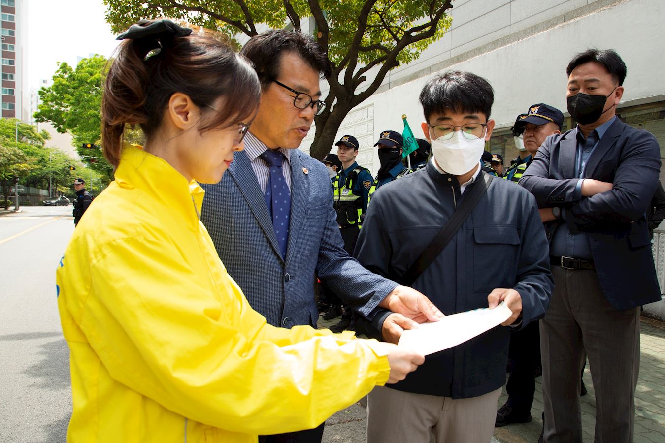 ![]() 图6:韩国法轮大法佛学会向釜山总领事馆出入警察传达佛学会声明书。 |