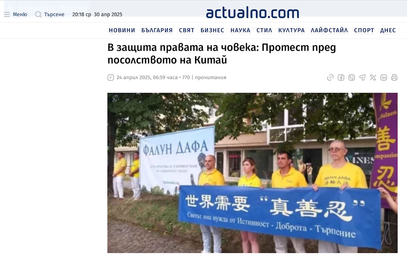 媒体Actualno.com对法轮功学员的和平请愿进行了报道,文章题目为:“捍卫人权:中国(共)大使馆前的抗议”。媒体Bulphoto也专门派遣了摄影师报道了学员的活动。