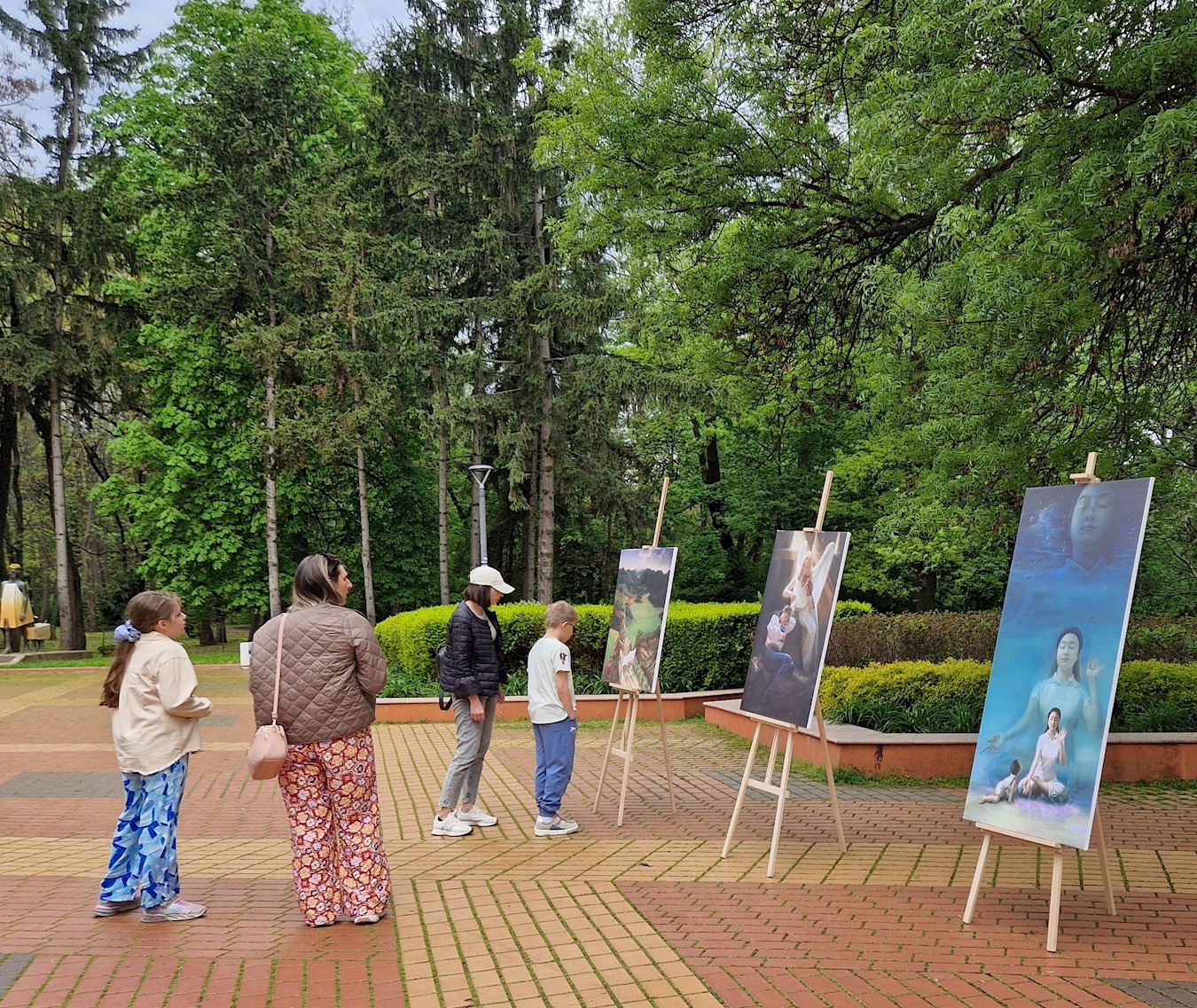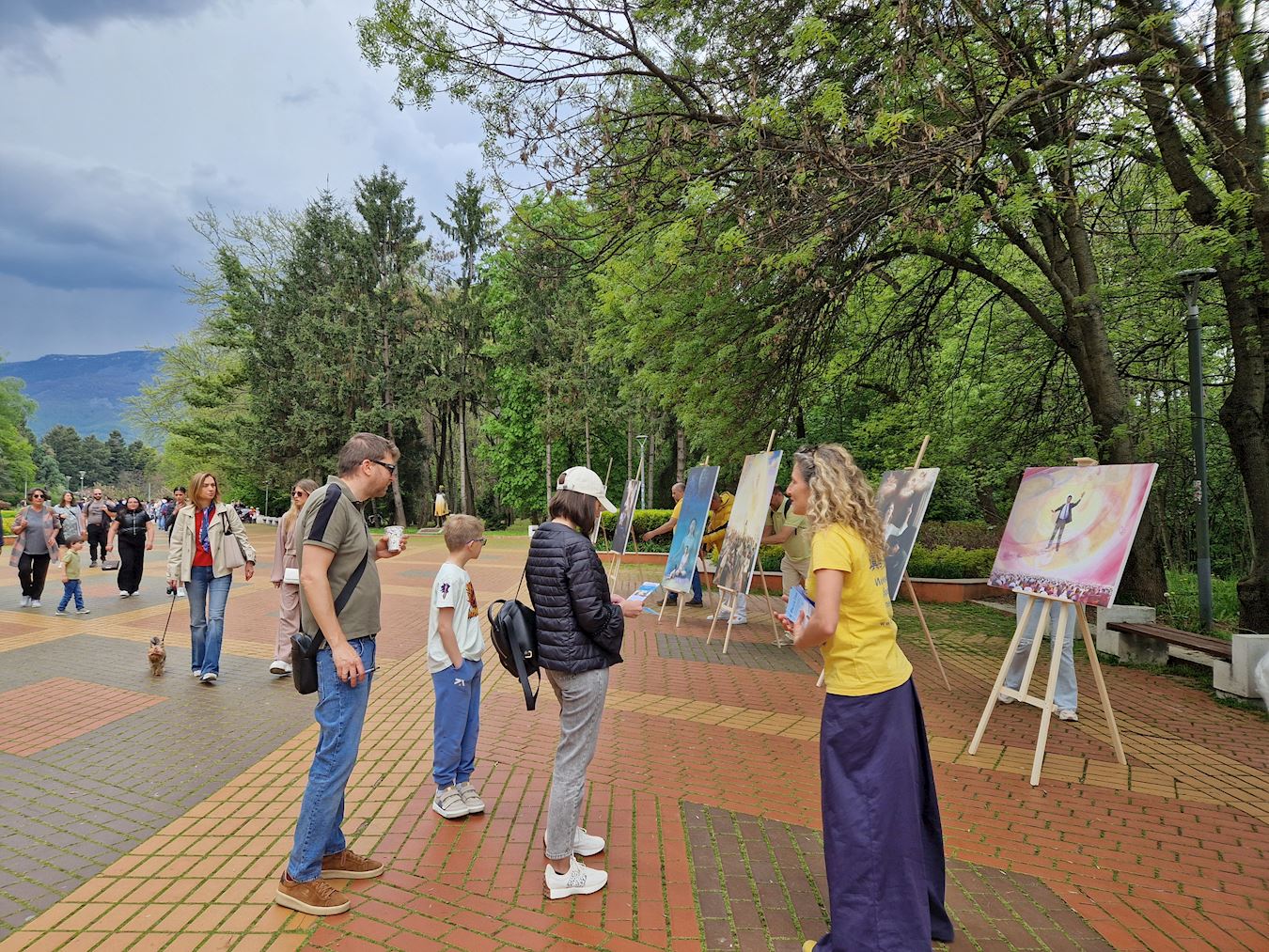学员们于四月二十六日在索菲亚南公园(South Park)入口处举办了真善忍美展,向更多民众讲述法轮功真相。
