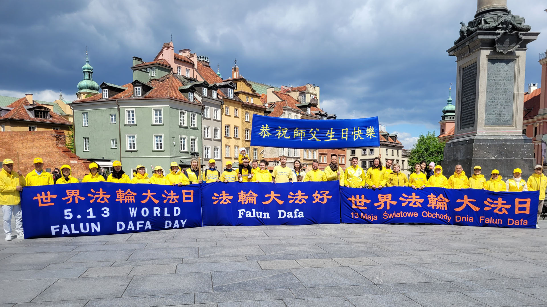 图1:二零二五年五月四日,波兰法轮功学员在华沙古城广场集体合照庆祝世界法轮大法弘传三十三周年并恭祝师父生日快乐!