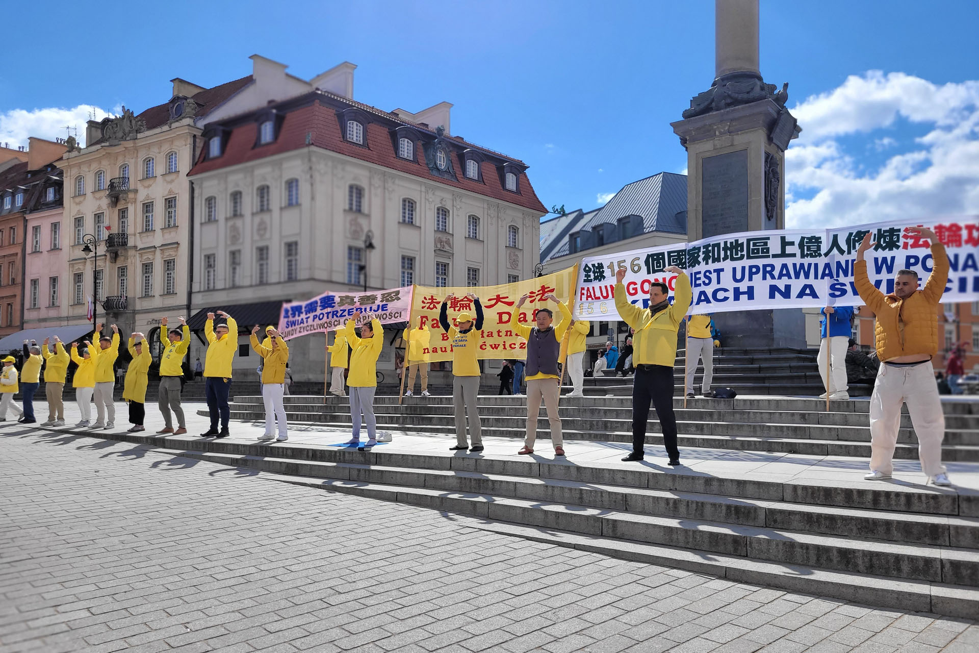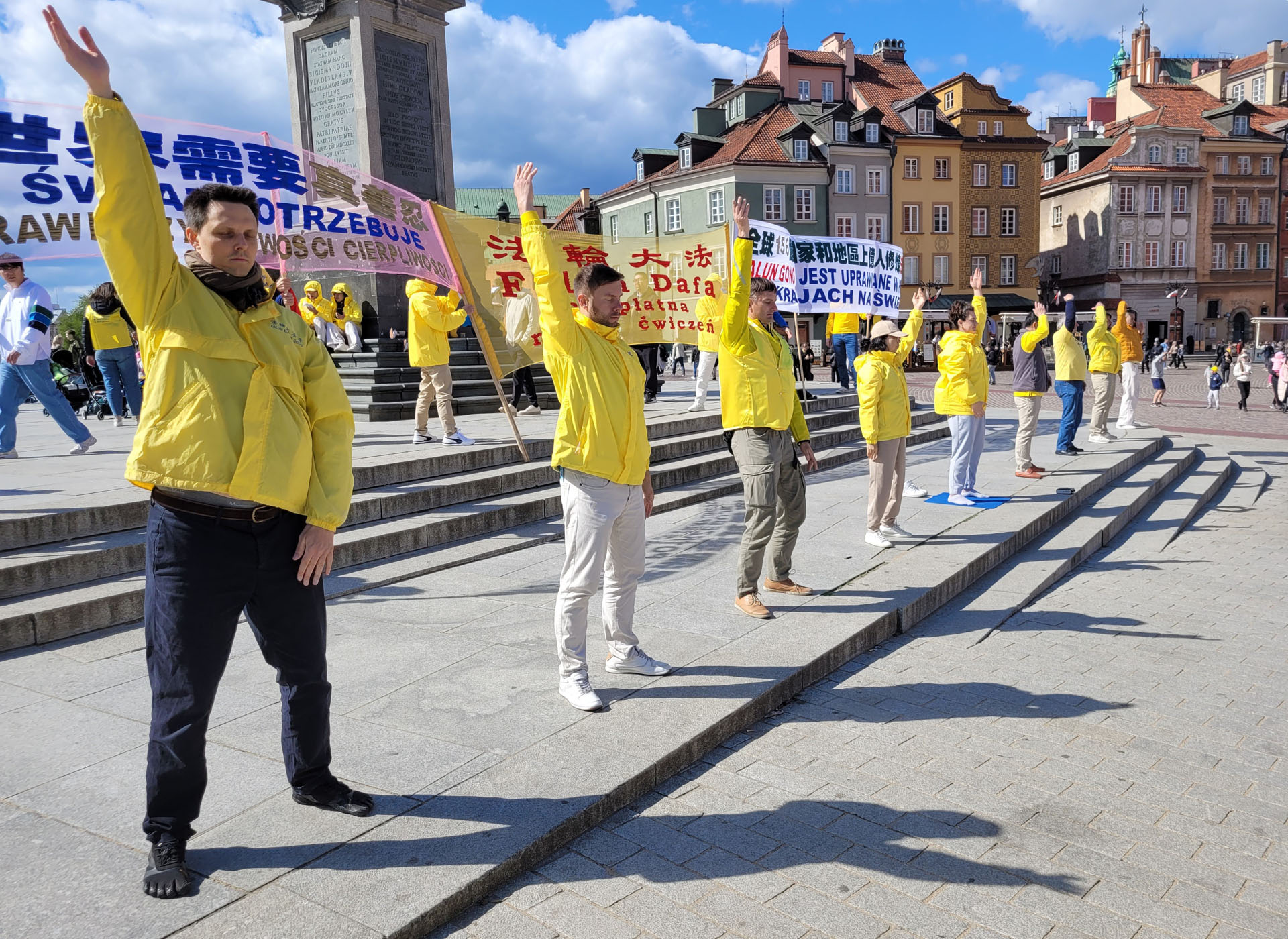 图2~5:波兰法轮功学员在华沙古城广场展示法轮功功法,发正念,感恩大法和大法师父。