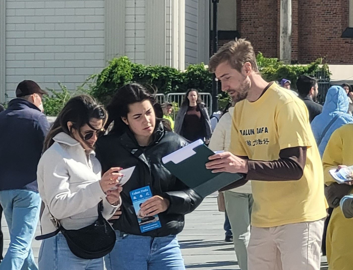 图14:波兰法轮功学员托梅克(右)在和游客讲真相。
