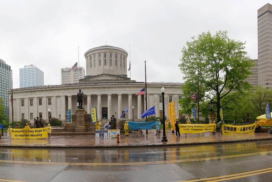 ![]() 图1:二零二五年五月六日,美国俄亥俄州的法轮功学员在首府哥伦布市举行集会,庆祝世界法轮大法日。 |
