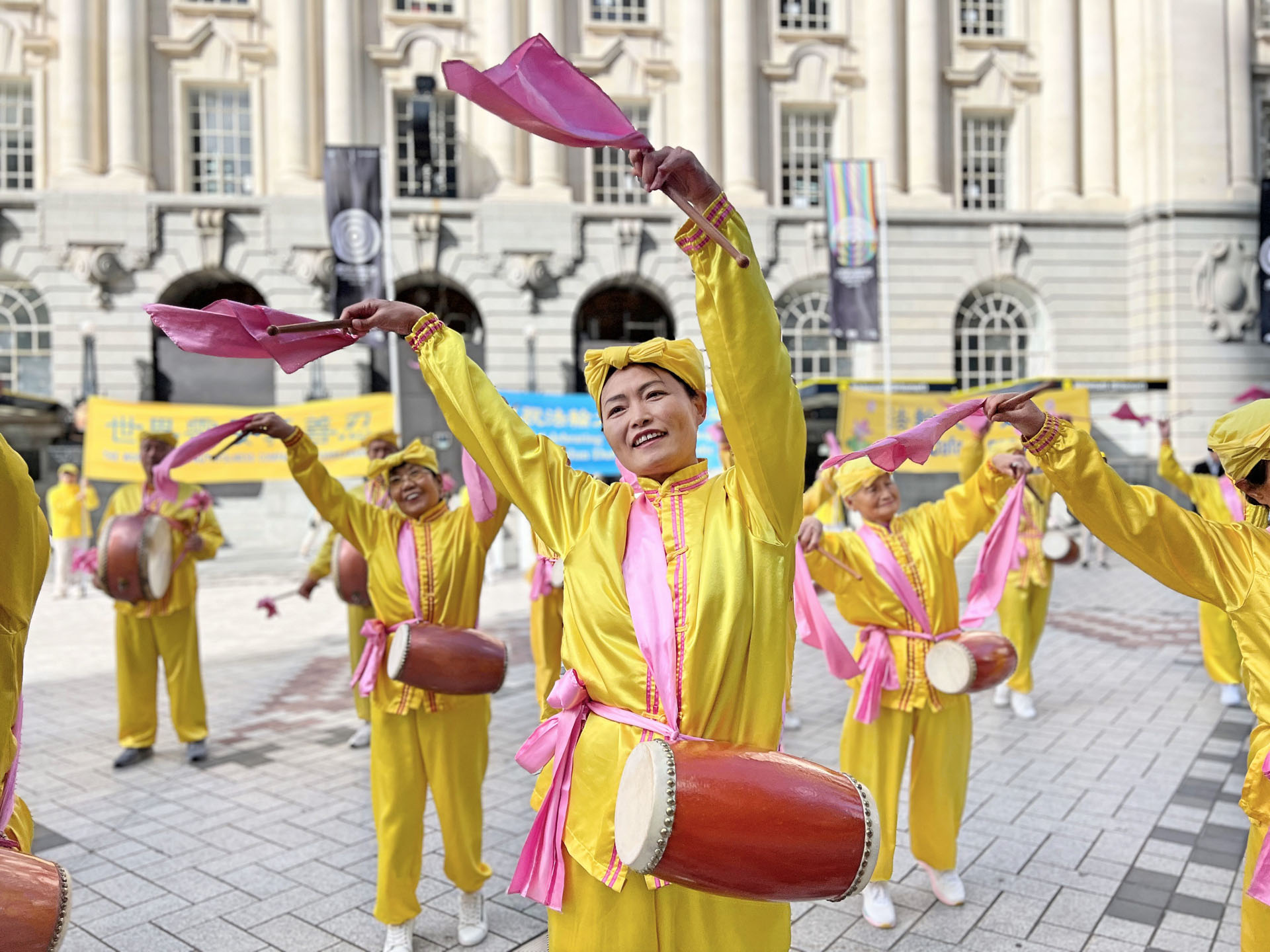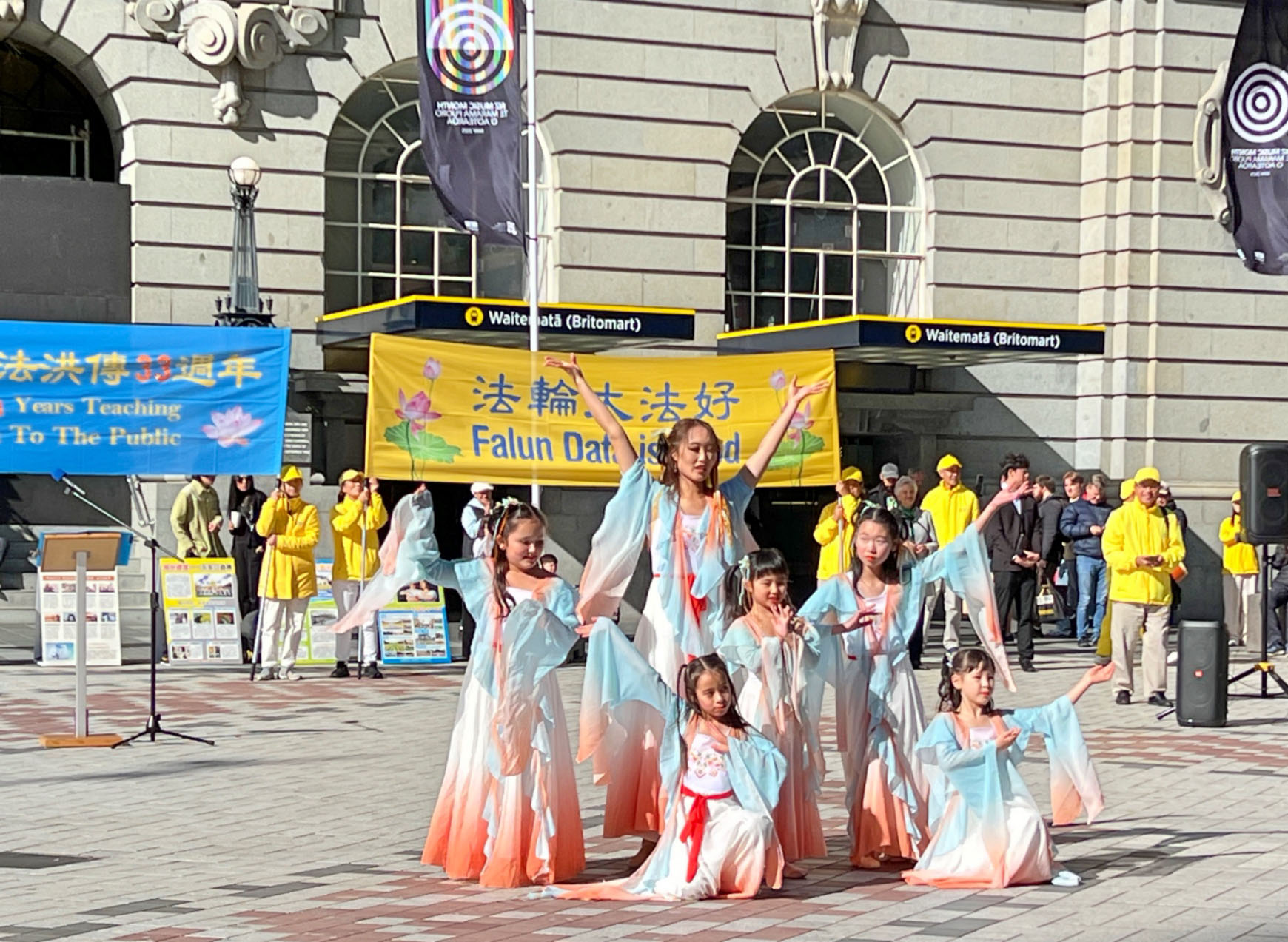 当天阳光明媚,现场气氛祥和,不仅有法轮功学员的集体炼功,还有由学员组成的天国乐团、腰鼓队、舞龙队的精彩表演,以及青少年学员表演的中国古典舞蹈,吸引了许多市民驻足观看、拍照、录像,主动来了解法轮大法。