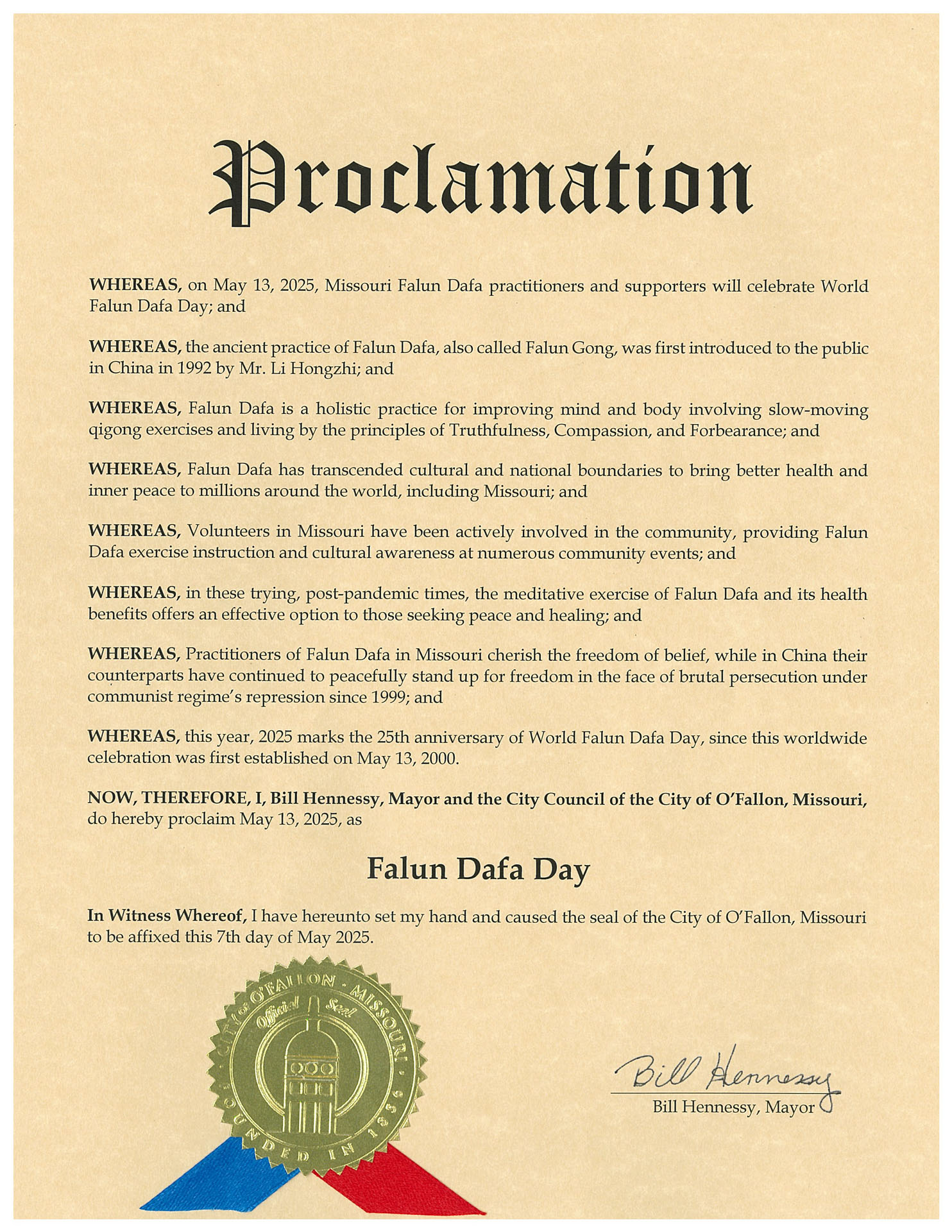 现在,鉴此,我,比尔·汉尼斯(Bill Hennessy),奥法隆市(City of O’Fallon)市长和市议会特此宣布,二零二五年五月十三日为法轮大法日。