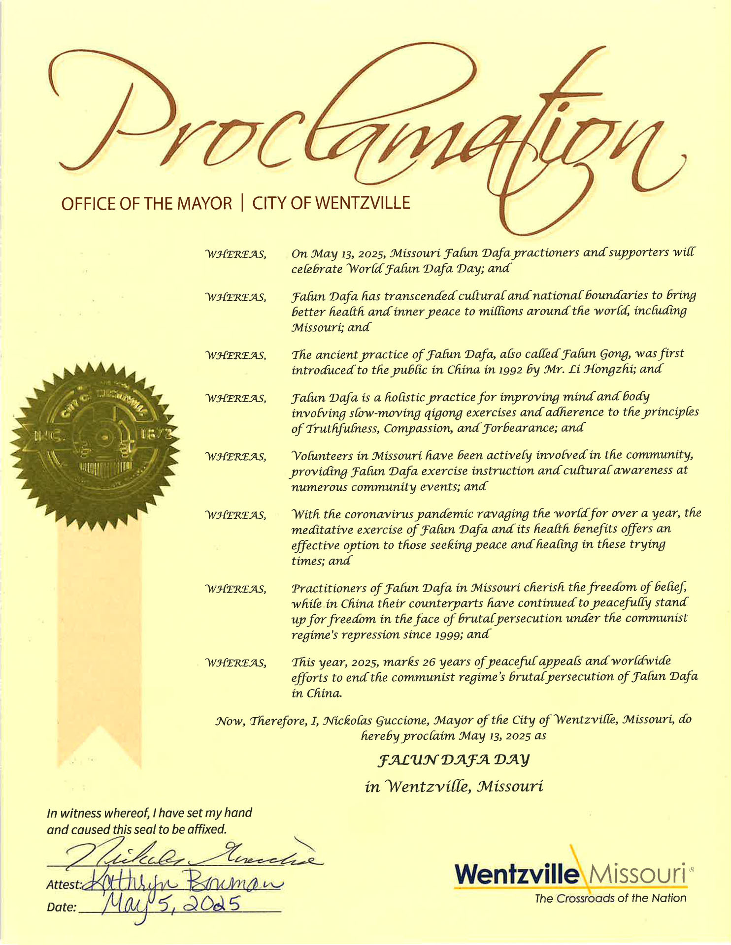 现在,鉴此,我,尼古拉斯·古奇昂(Nikolas Guccione),温茨维尔市(City of Wentzville)市长,宣布二零二五年五月十三日为密苏里州温茨维尔市的法轮大法日。