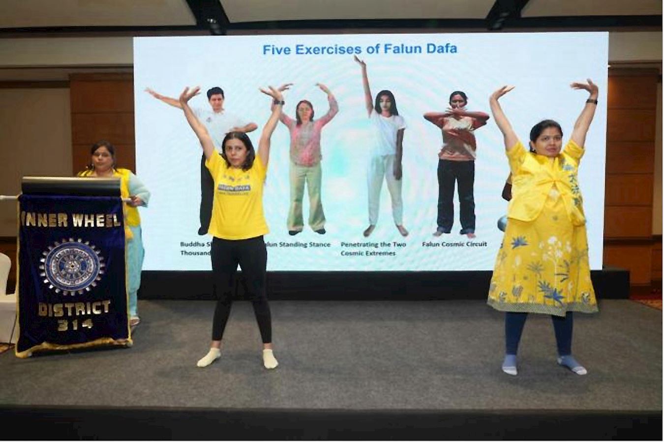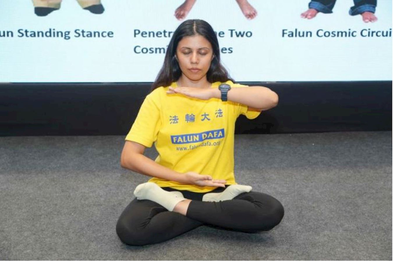 学员首先播放了一段关于法轮大法的短视频,然后进行深入的讲解,并现场展示了第一和第五套功法。观众们认真观看了功法演示,她们被柔和、缓慢、流畅的动作及平静的音乐深深吸引,对学炼法轮功表现出浓厚的兴趣。