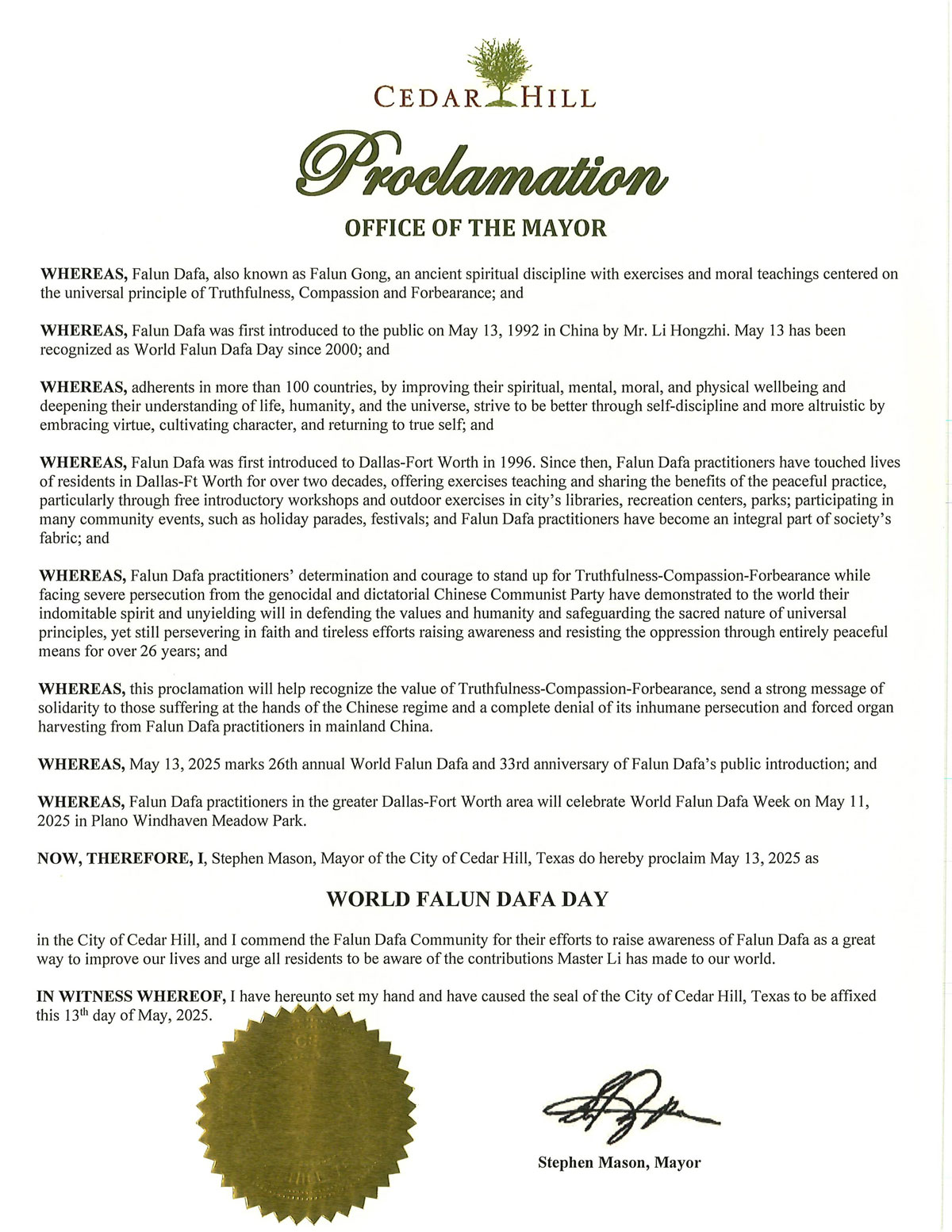 因此,我,斯蒂芬·梅森,雪松山市市长,在这里宣布二零二五年五月十三日为德克萨斯州雪松山市市“法轮大法日”。