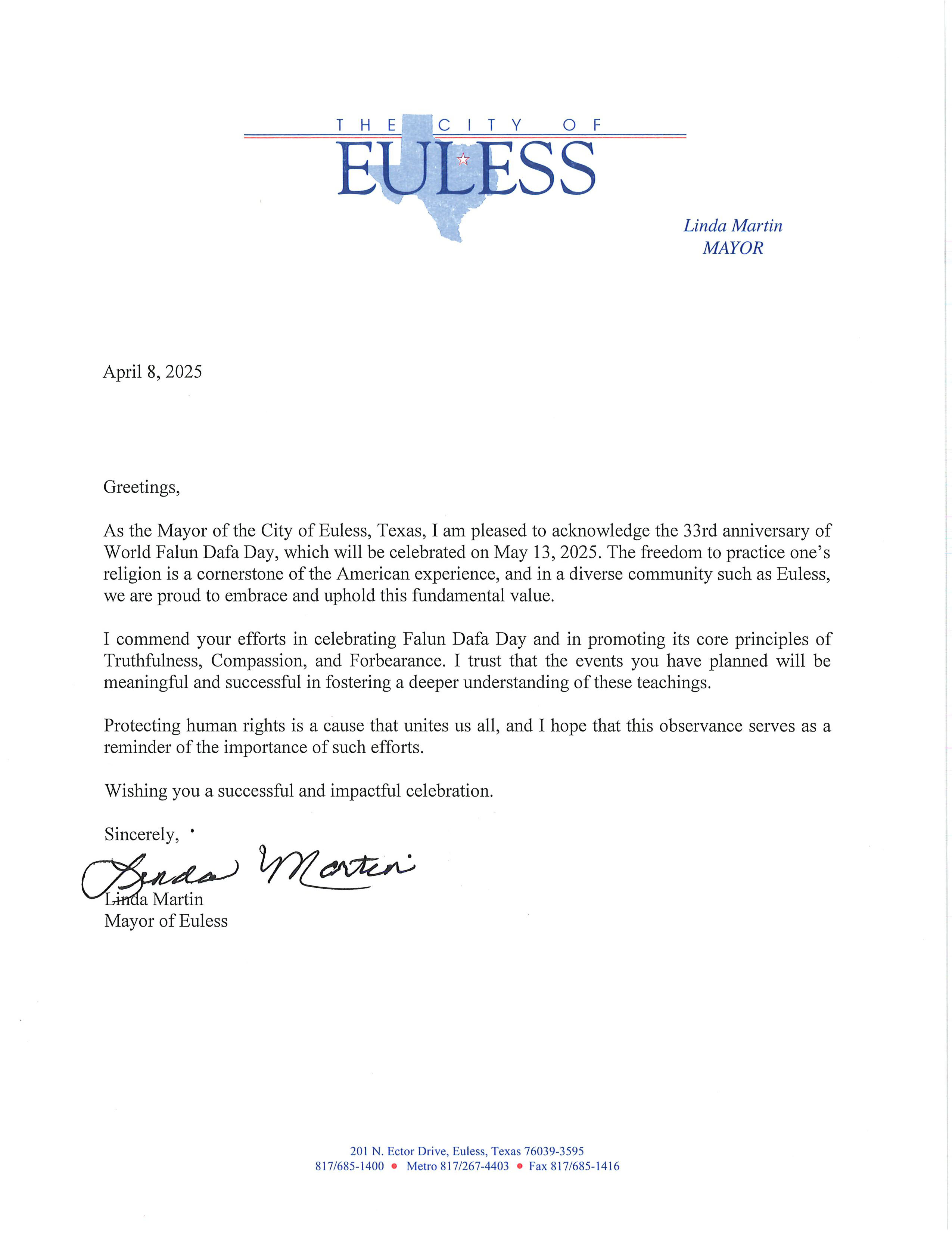 作为德克萨斯州尤利斯市市长,我很高兴在此祝贺将于2025年5月13日举行的第33届世界法轮大法日纪念活动。