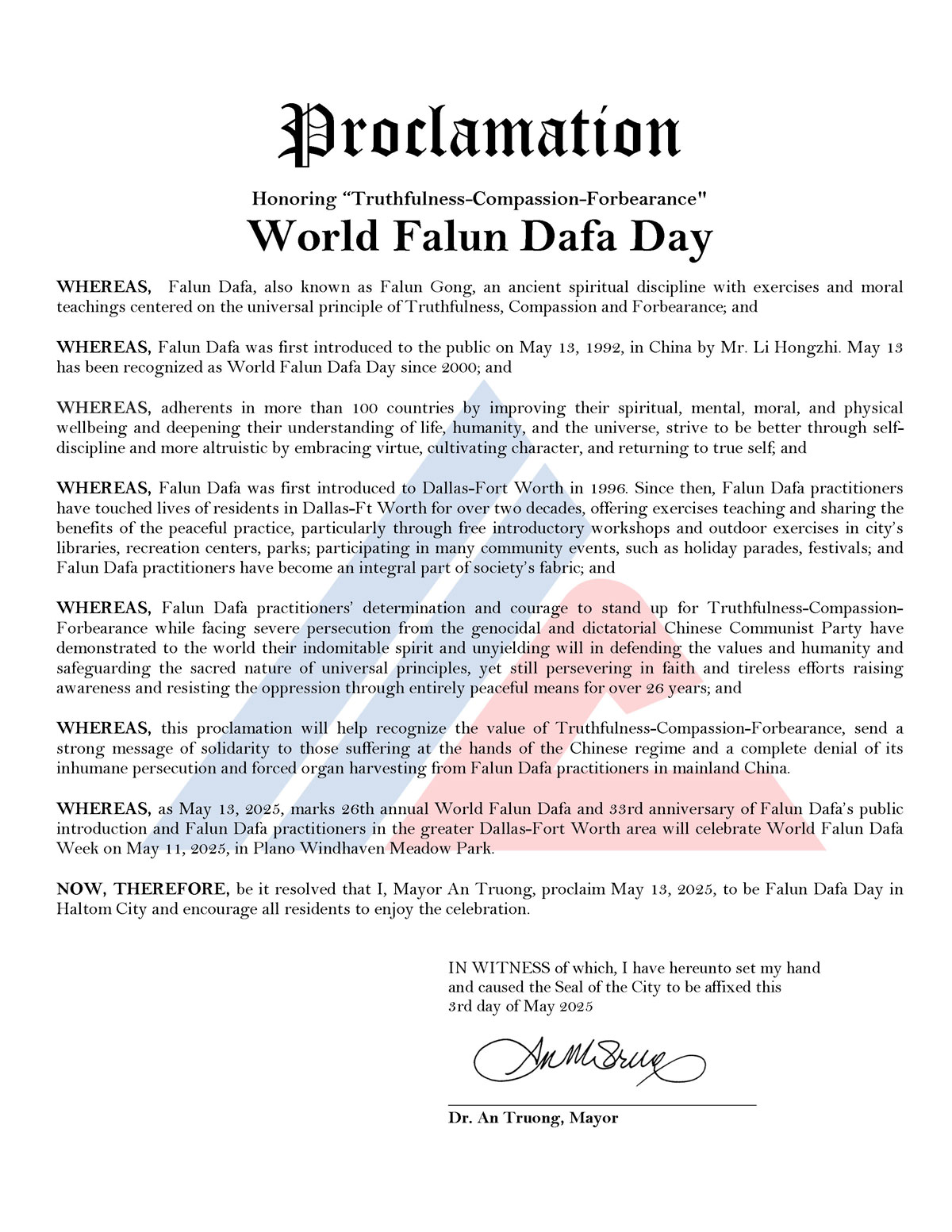 因此,我,安·张,哈尔顿市市长,在这里宣布二零二五年五月十三日为德克萨斯州哈尔顿市市“法轮大法日”。